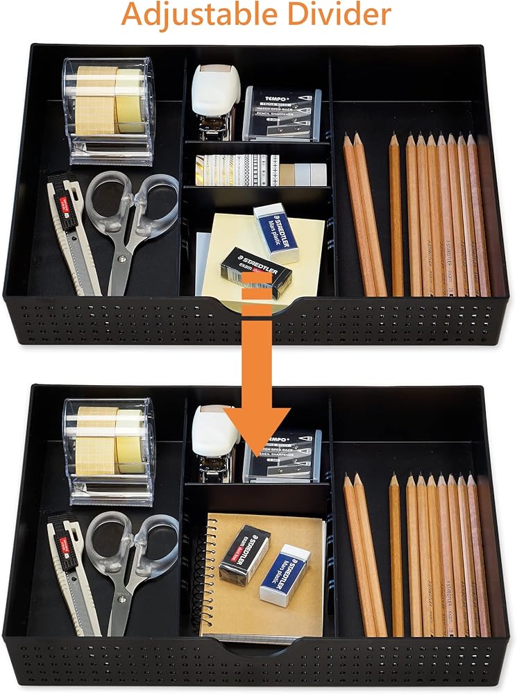 ADJUSTABLE DRAWER ORGANIZER: Our drawer organizer has 3 sections with 1 section in the middle adjustable perfect for desk accessories, pencils, pens and others