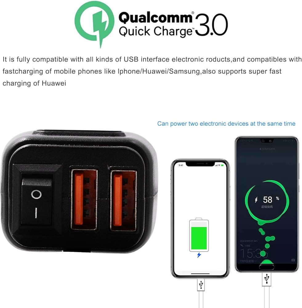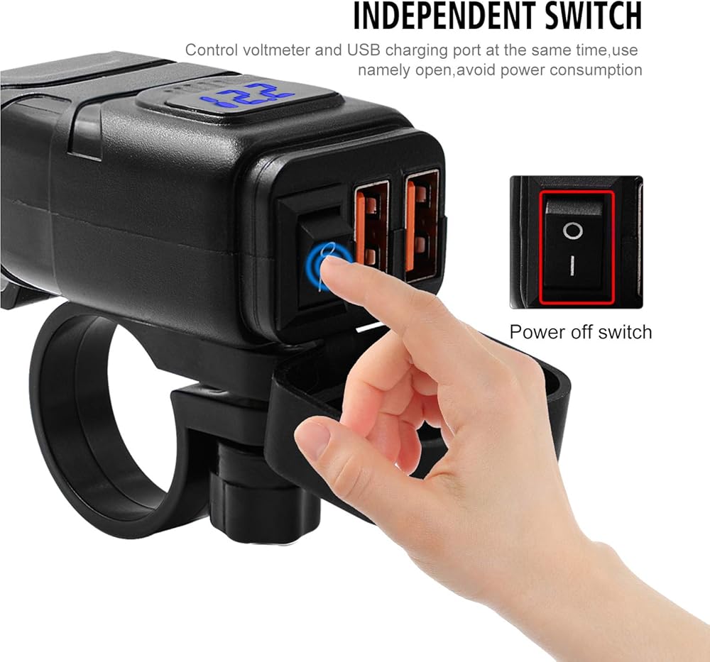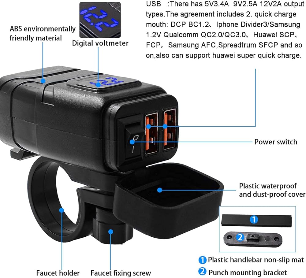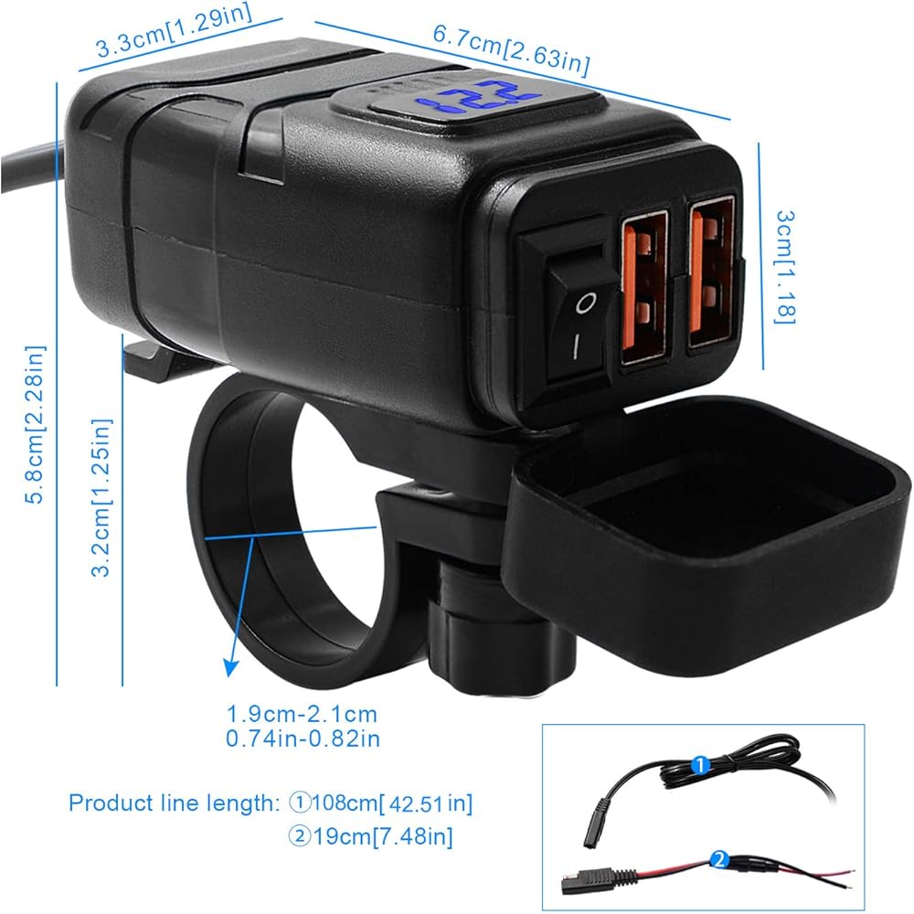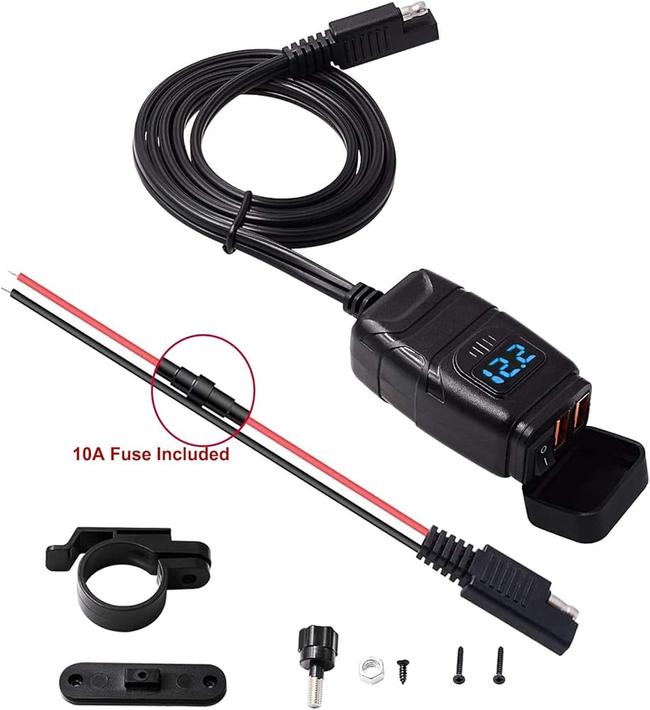 Motorcycle USB Phone Charger, Waterproof Dual Port QC3.0 USB Fast Charger with 12V Voltmeter and ON/Off Power Switch & 10A Fuse, SAE to USB Adapter Motorcycle Accessories for Phone, GPS, Tablet (Blue)