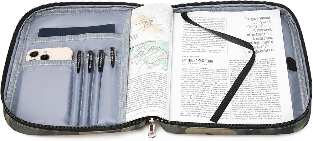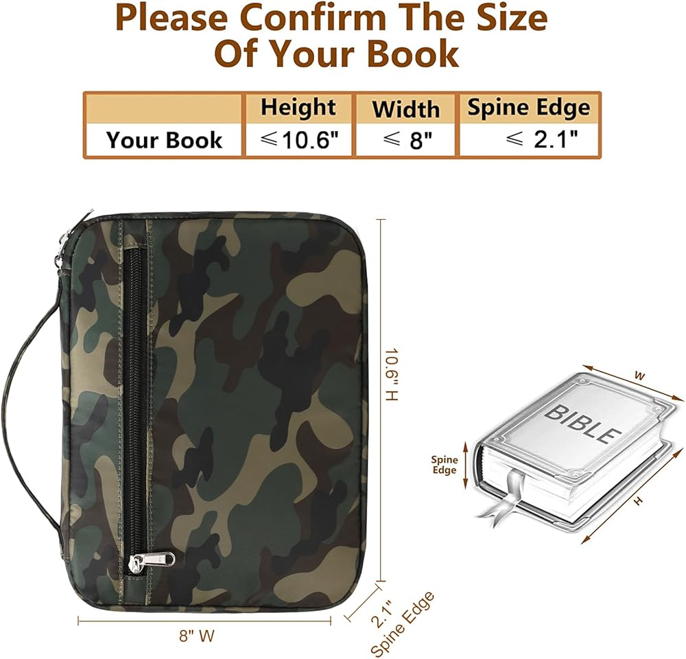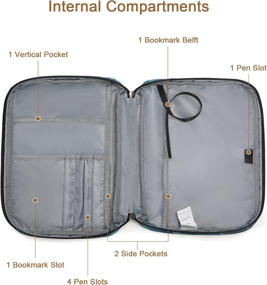 Large Space: Perfect for standard or smaller size Bible: 10.6" x 8.1" x 2.2". Can be an excellent Bible holder, journal case, paperback book cover, makeup cosmetic bag, tablet case, Bible study book bag, etc. The additional inner pockets allow you to store Bible highlighters, pens, prayer journals, church bulletins, sermon notes, prayer cards, notes or bookmarks.