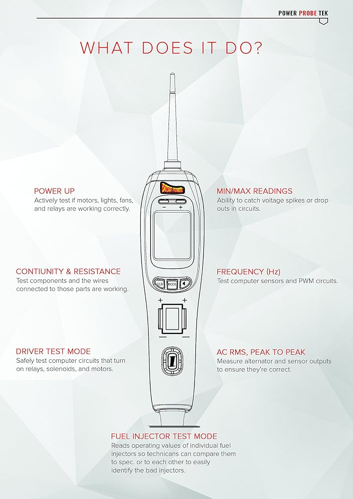 - AC-RMS, AC Peak to Peak, Frequency and Pulse Width for signal testing.
