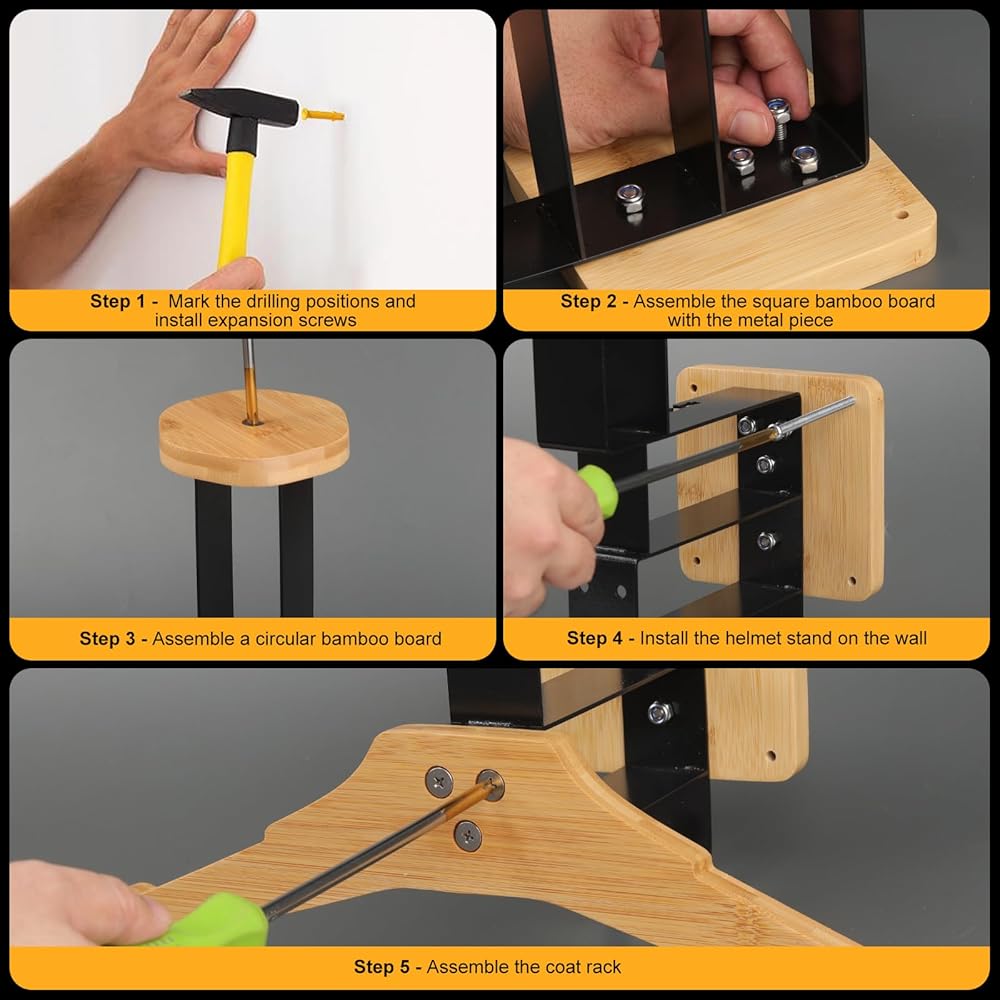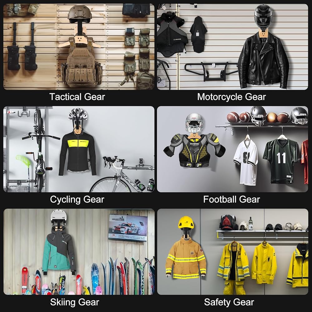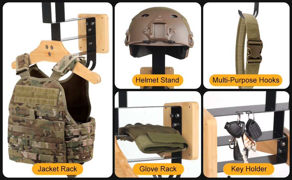 WIDELY APPLIED: This wall-mounted gear rack is a collection of helmet racks, coat racks, compartments, hooks, etc., which is suitable for storing and organizing all kinds of professional gears, including tactical gears, motorcycle gears, baseball gears and ski gears.