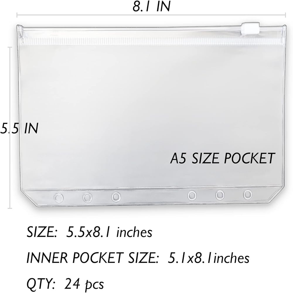 Package includes 24 pieces A5 binder pocket. Size(W x L): 5.5 x 8.1 inches, pocket part size(W x L): 5.1 x 8.1 inches.