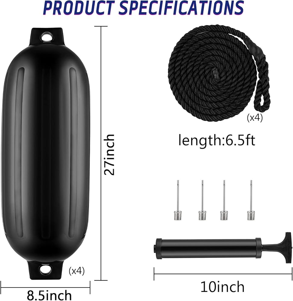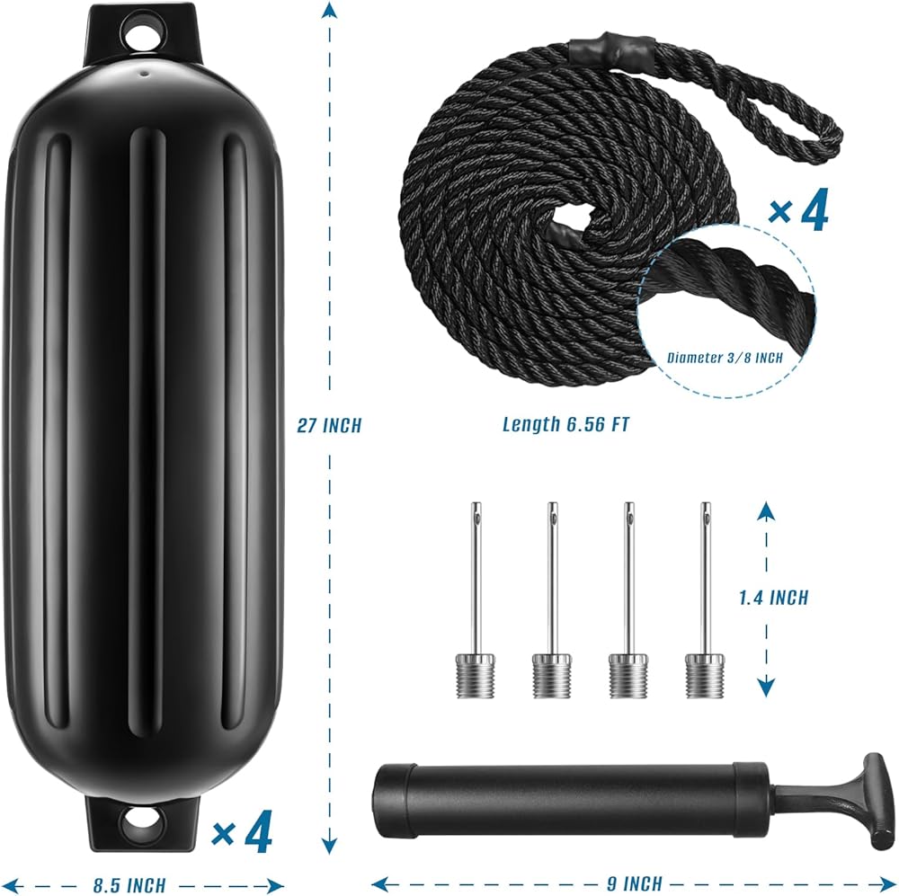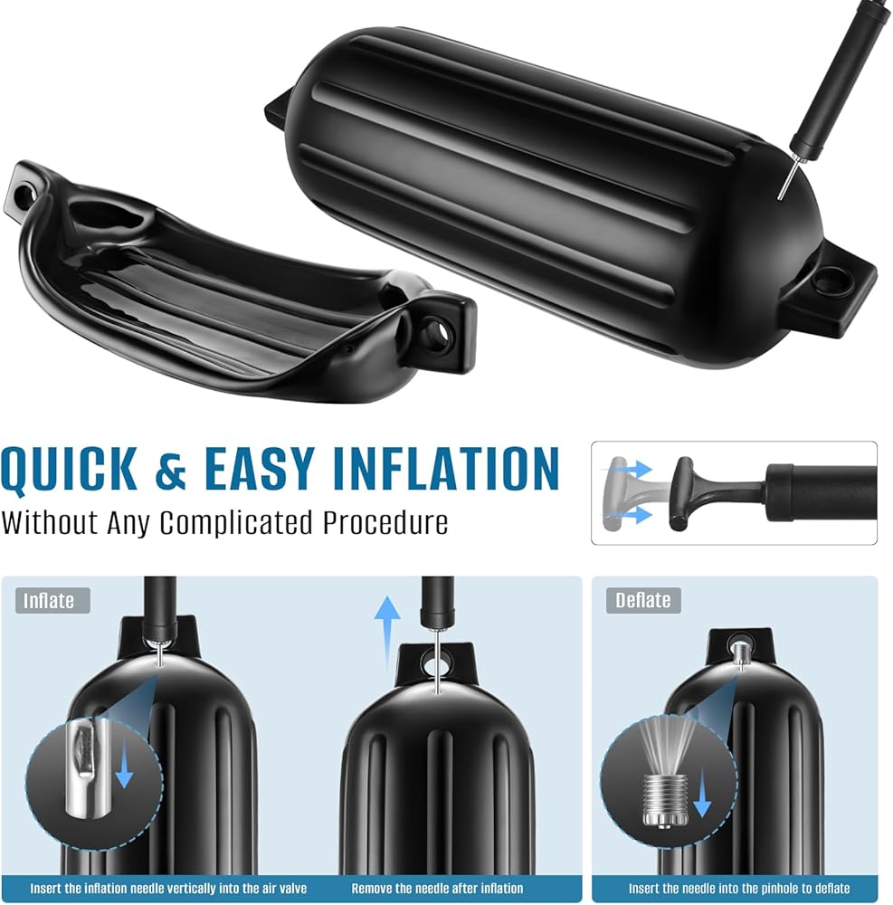 Easy to Install -Package includes four boat fenders, inflating needle, four ropes, and one hand pump. The fenders are easy to inflate and deflate. One person can quickly inflate all four fenders in 10 minutes without any complicated procedure. There are also four dock ropes for easy suspension.