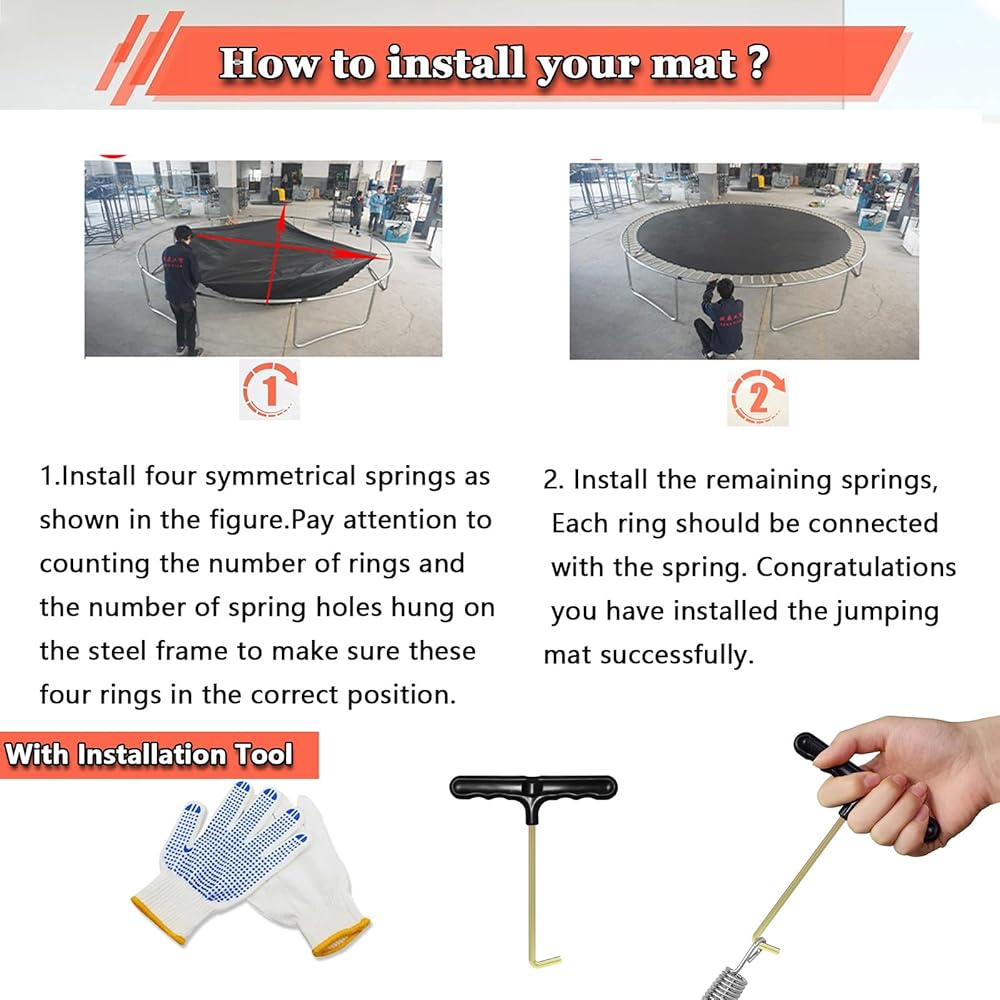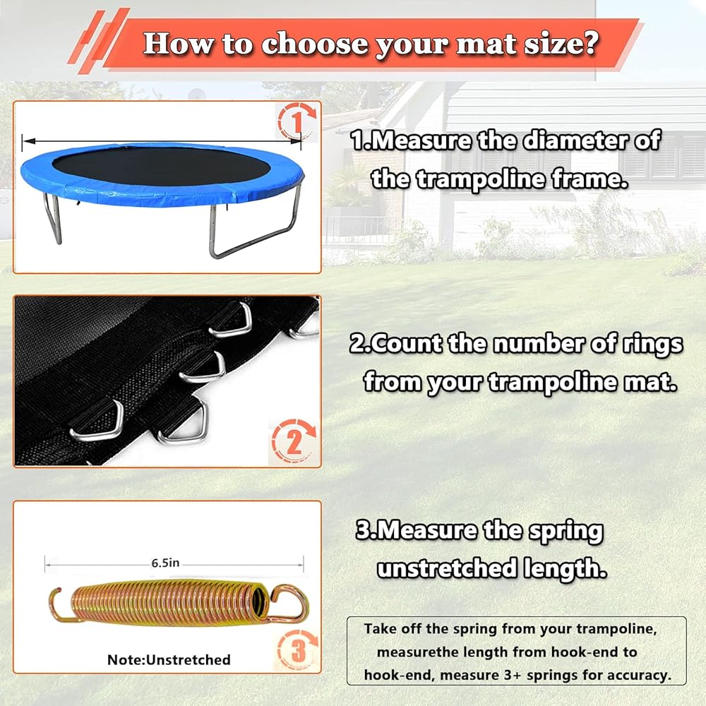 Please make sure to measure your current mat size, and spring size and count your mat's v-rings to select the appropriate Mat for your trampoline.