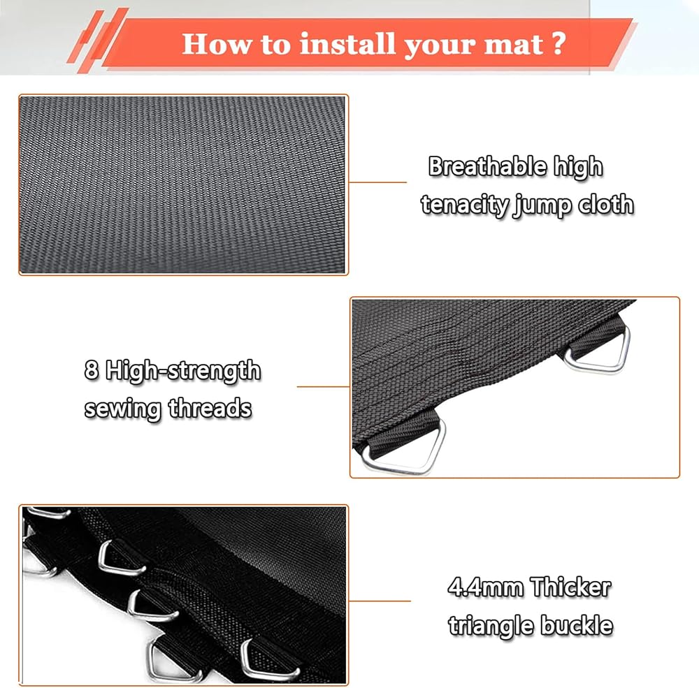 This is a black replacement jumping mat made of Premium PP(Polypropylene), 8 rows of stitching hold the v-rings securely in place.