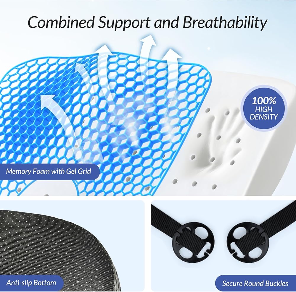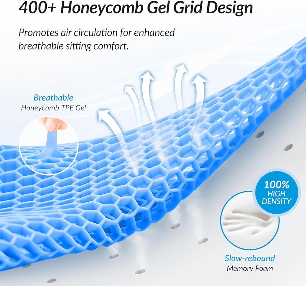 Say Goodbye to Sitting Sultry: This car pillow for driving seat features a breathable honeycomb gel that is matched with a mesh cover to optimize air circulation. This helps to reduce sweating and the risk of hemorrhoids. The gel seat cushion for car is an excellent solution for long drives as it dissipates heat, even in hot weather.
