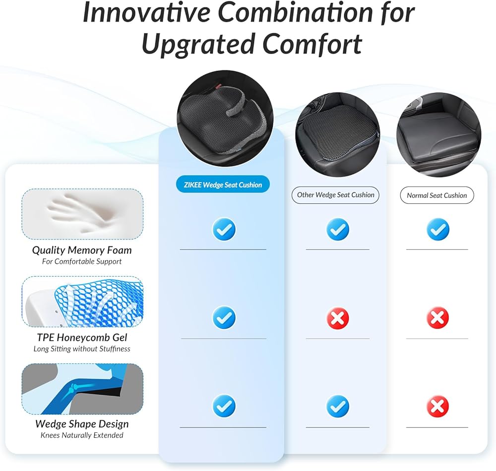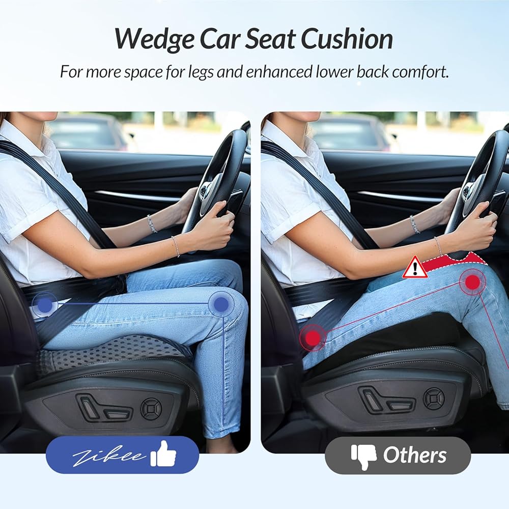 ZIKEE Wedge Car Seat Cushion for Driving, Innovative Seat Cushion with Honeycomb Gel & Memory Foam for Enhanced Breathability & Support, Car Cushions for Hip Pain Relief, Improve Vision/Posture, Black