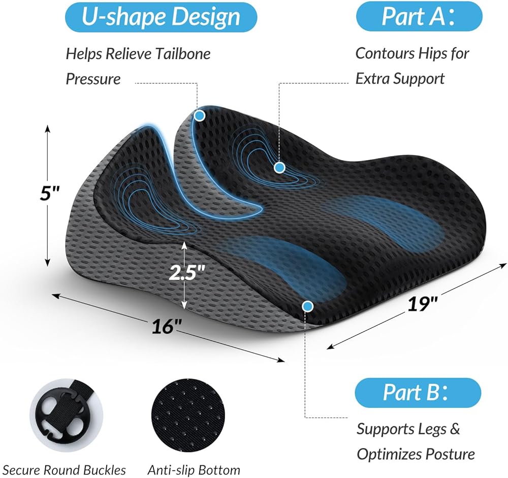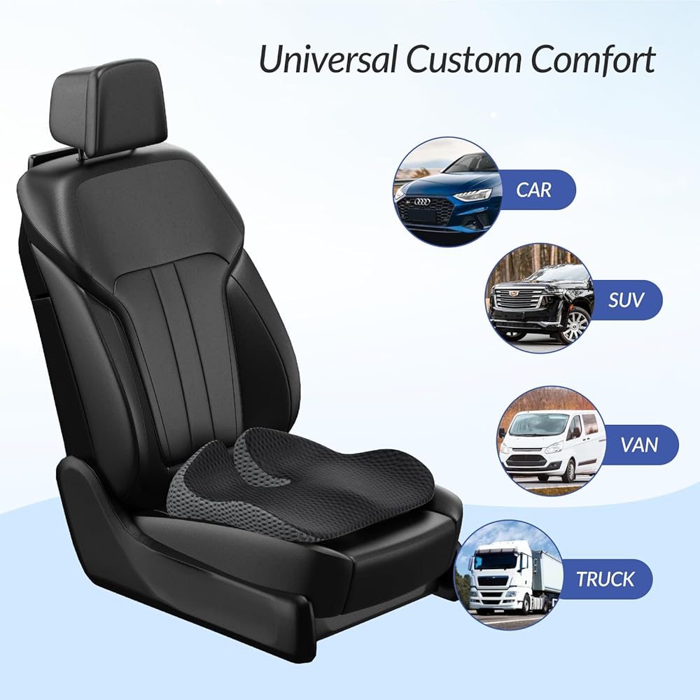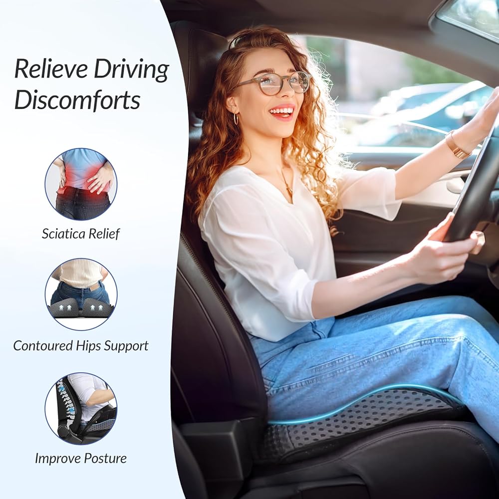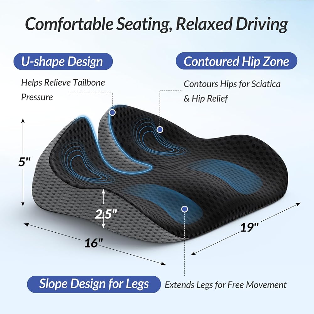 Innovative Combination of Honeycomb Gel & Memory Foam: This seat cushion for car seat driver is uniquely designed with a combination of honeycomb TPE gel and slow-rebound memory foam. It conforms to your body and helps to reduce lower back pain and discomfort in the buttocks by softening bumps in the road. Unlike other pure memory foam cushions on the market, this car accessory has enhanced breathability due to the TPE gel.