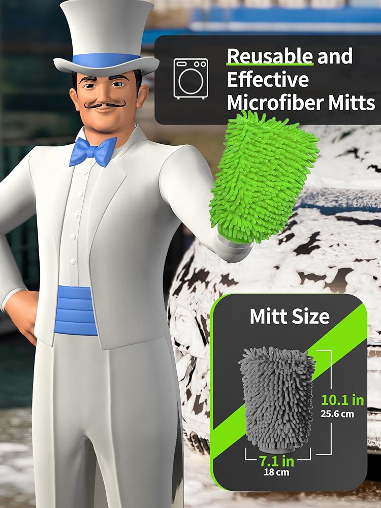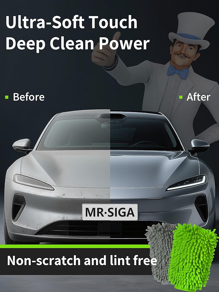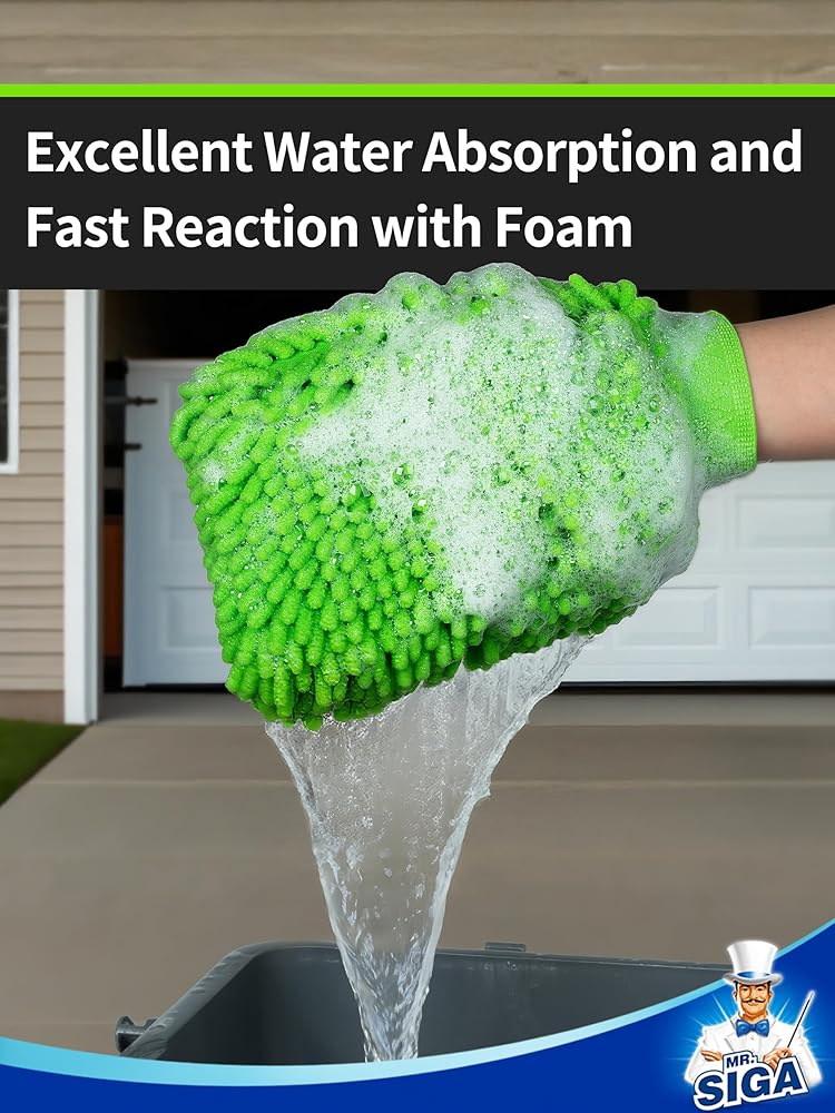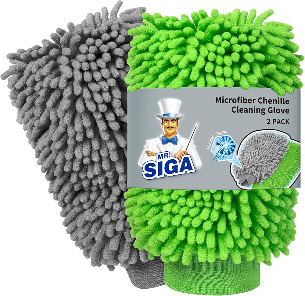 MR.SIGA microfiber soft chenille mitt has great absorption, double sided, which holds water and soap excellently, perfect for cleaning vehicle, motorcycle, furniture etc quickly and safely.