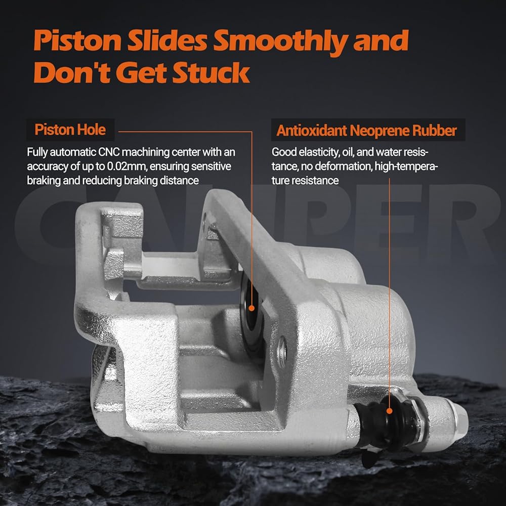 [Brake Caliper Material]: The brake caliper is made of the same ductile iron as Original Equipment parts, it does not deform under high temperatures and can prevent deformation and breakage during sudden braking, so it has a long service life.