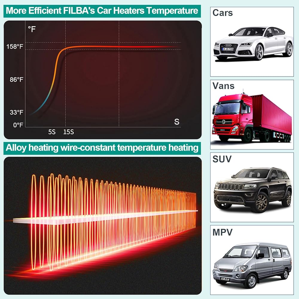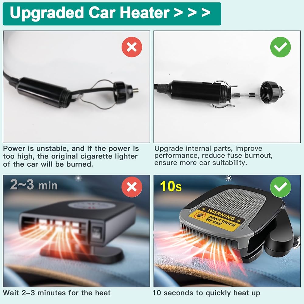FILBA portable car heater is upgraded in quality and a built-in fuse in the cigarette lighter plug, which automatically cuts off the power when there is a safety hazard, making it safer and more worry-free.