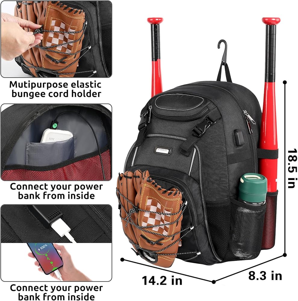 Large Capacity: Dimension of Youth Baseball Backpack: 19*14*8.25 Inch.Designed with room for all your baseball gear, each bag stores up to four bats or water bottles, a baseball helmet, batting gloves, cleats, baseball cap, and catching glove and everything you need for winning game.
