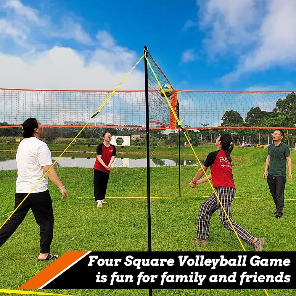 Complete Game Set for Whole Family Fun: This four square volleyball game set come with a soft volleyball and storage bag, boundary line, rubber hammer, carrying bag, and ball pump with needle. It is suitable for 2,3 or 4 person team play together, allowing you take the outdoor volleyball net to backyard, park, Lawn and beach, Enjoy a recreational volleyball or badminton game with your friends or families, they will have a blast with it!