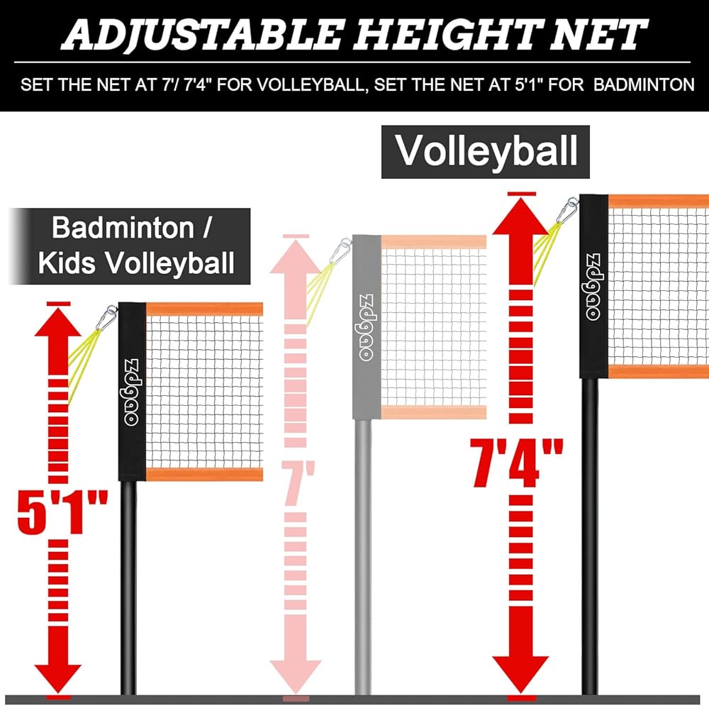 Height Adjustable for both volleyball & Badminton net set: This 20' x 20' four way volleyball net with press-lock button system for easy height conversion. The full height is 7.4' for both men or women playing volleyball game which can be set to volleyball height at 7' and lowered to regulation badminton height at 5'1 ".