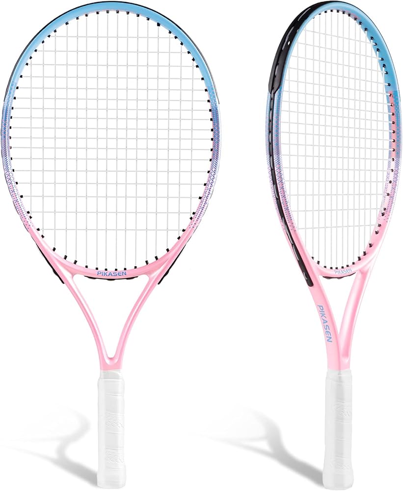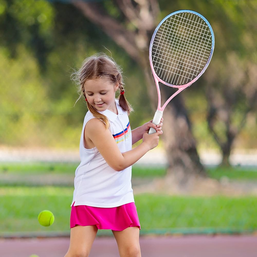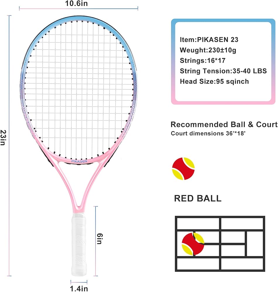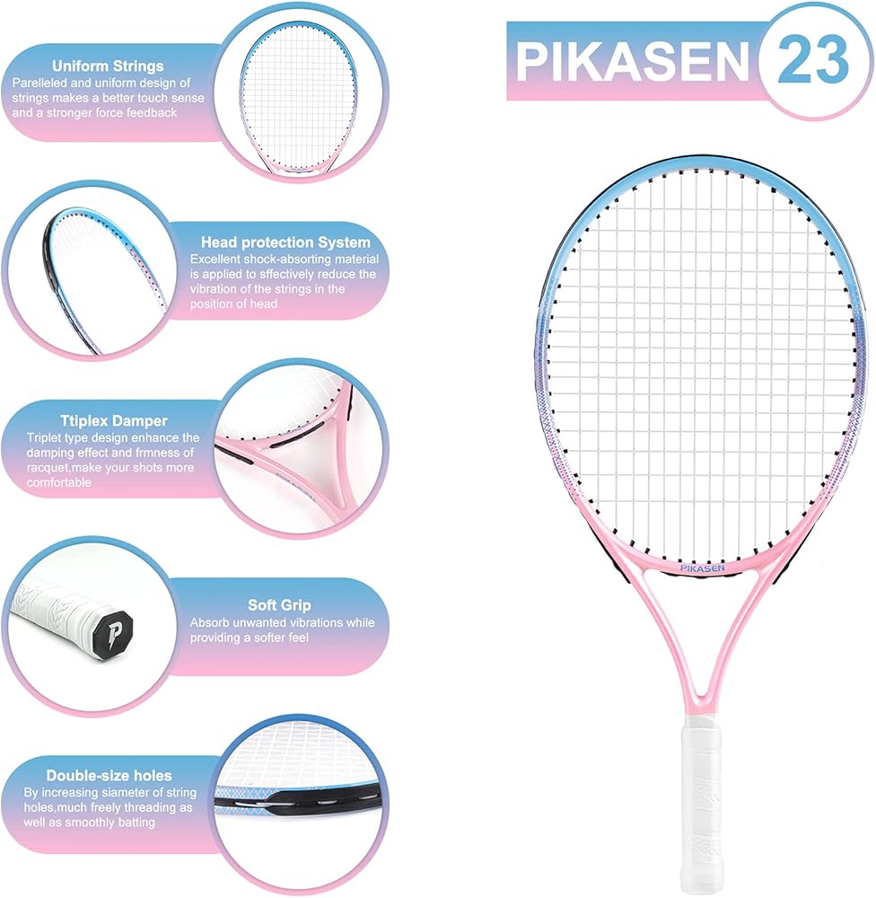 👍 إطار كبير خفيف الوزن: يتميز مضرب التنس للأطفال بمكان جميل كبير. يمكن للأطفال قفل الكرة بسهولة بثقة مستمرة. هيكل خفيف الوزن يجعل المضرب أكثر مرونة. يمكن لمضرب التنس بيكاسن أن يلهم أطفالك ليكون لديهم اهتمام وثقة قويين بلعب التنس.