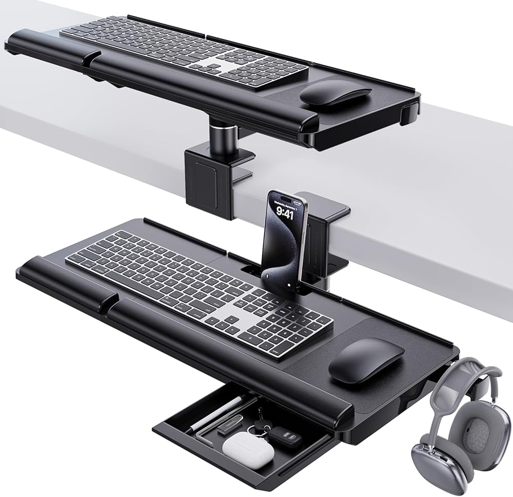 【Ergonomics & Maximize Desk Space】: placing your keyboard and mouse on the ergonomic tray improves comfort and creates additional space on the desktop.
