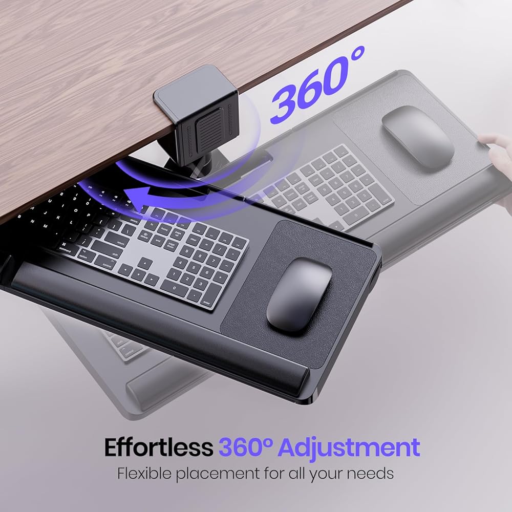 【360 Rotation Keyboard Tray Under Desk】: the keyboard mount with 360 degree rotation,you can freely rotate it and store away under the desk entirely when not in use. (Tips: desk requirement - the width of the desk need to be more than 34.8 inch to allow it to rotate under your desk)