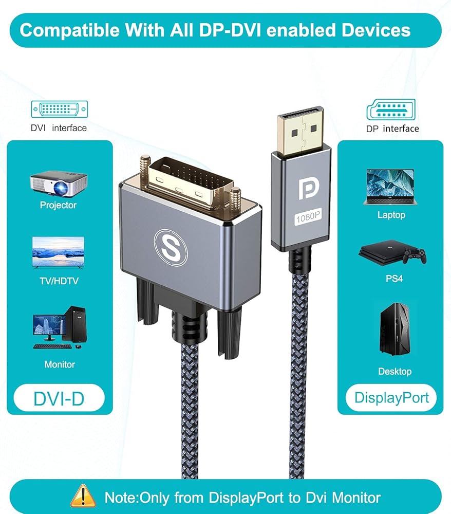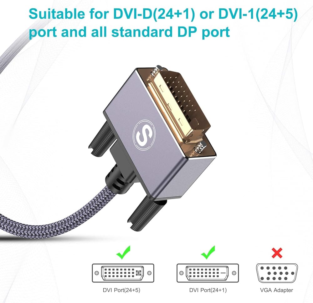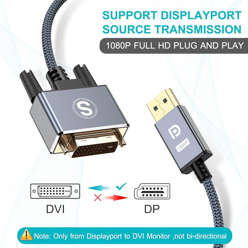 sweguard DisplayPort to DVI Cable 6.6ft, DVI to Displayport Adapter Cable, High Speed Gold Plated Nylon Braided DP to DVI Cable Compatible with Lenovo, Dell, HP, Monitor, and Other Brand