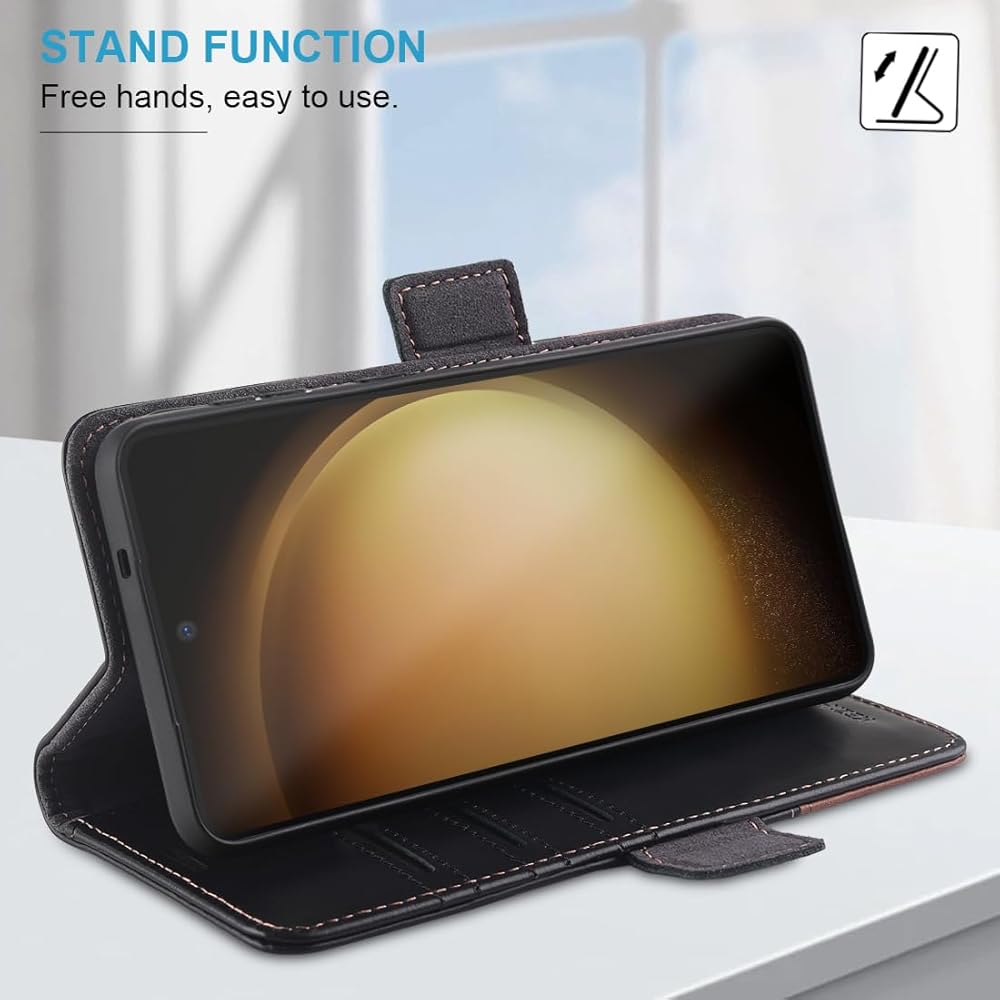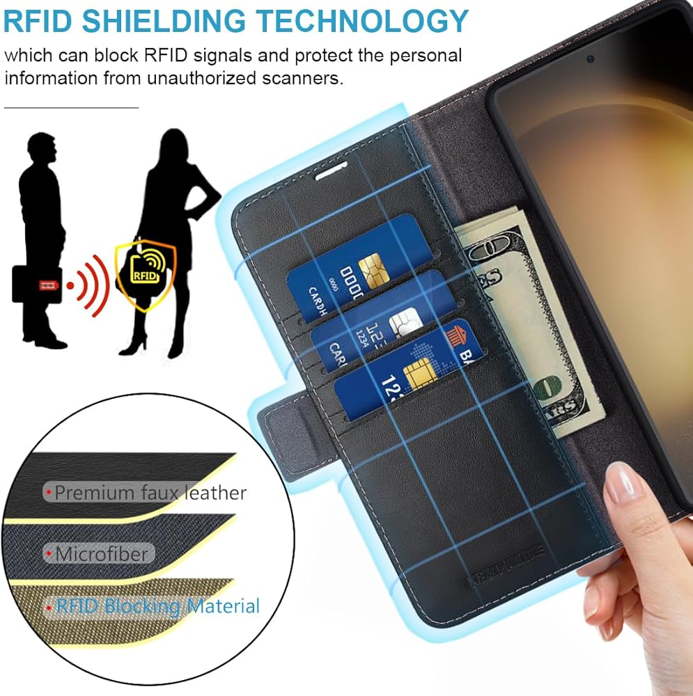 [MULTIFUNCTION] - (1). This Galaxy S24 Plus Wallet Case designed with RFID shielding technology which can block RFID signals and protect the personal information from unauthorized scanners. (2). Included 3 card slots and 1 money pocket, carry around your credit and debit cards, and cash. (3). Built-in stand feature, for hands-free movie-watching, read, video-chatting.(4). Magnetic flap to keep it closed and protected, secure magnetic closure.