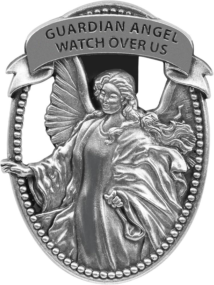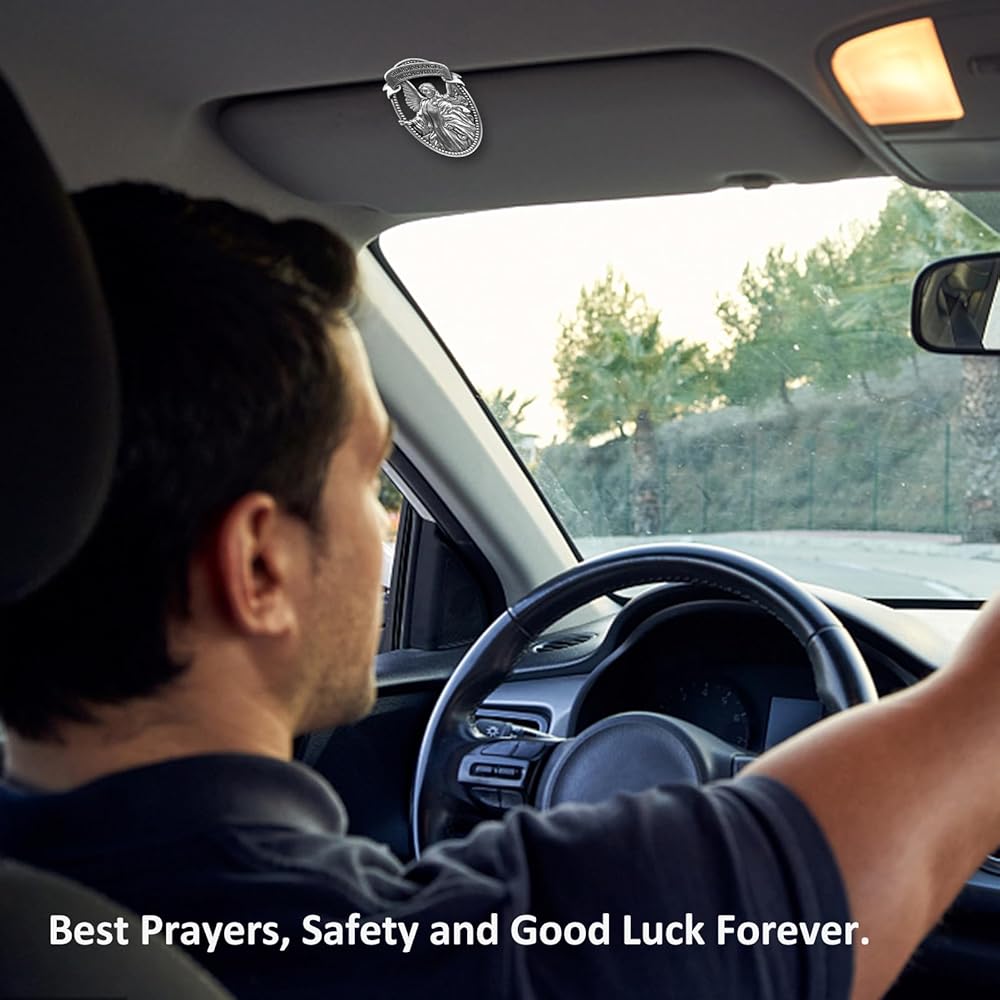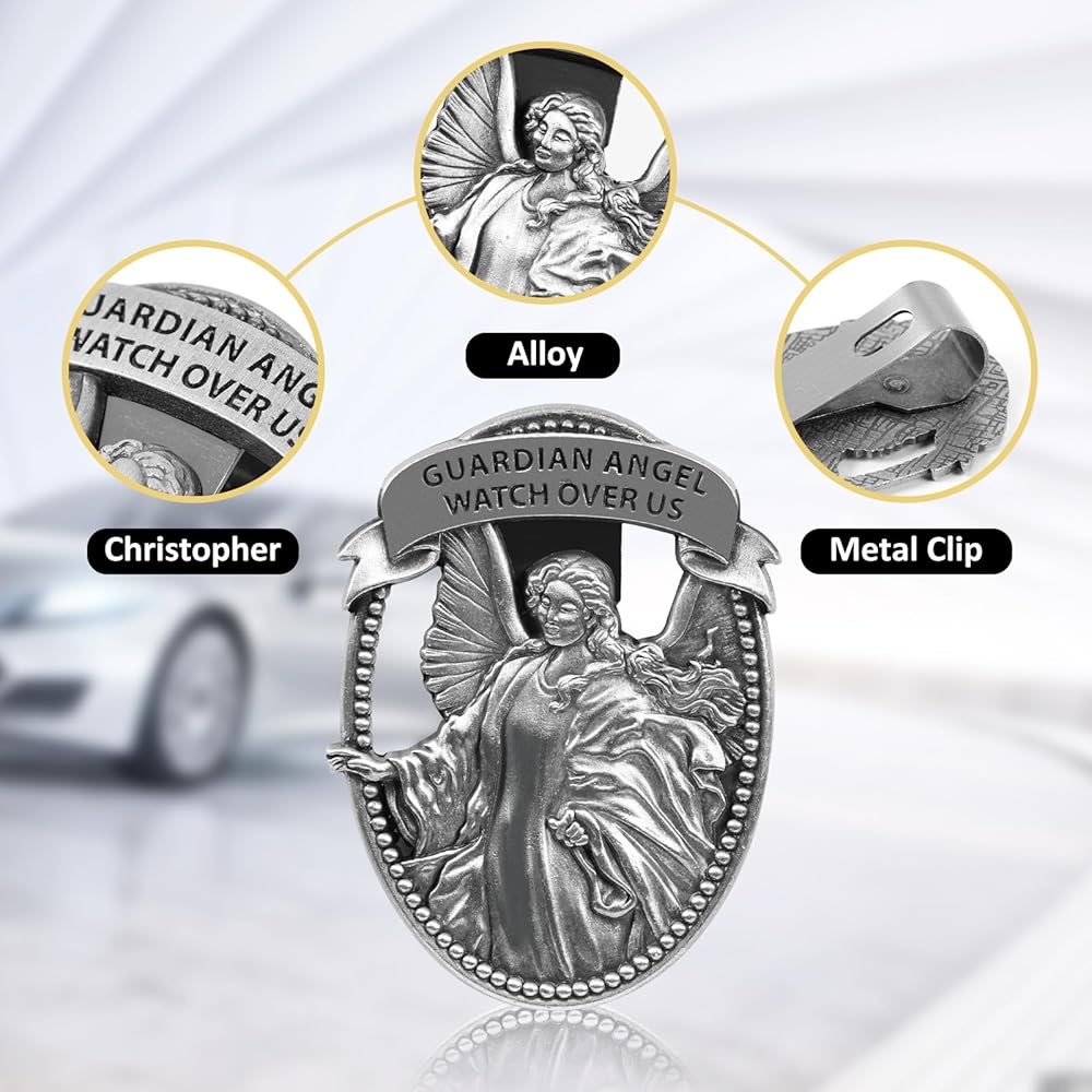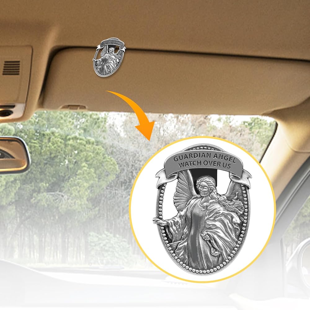 PRAYER DRIVING SAFETY - The word "GUARDIAN ANGEL WATCH OVER US" engraved on the St. Christopher medal car guardian angel visor clip, which will bless driver while driving