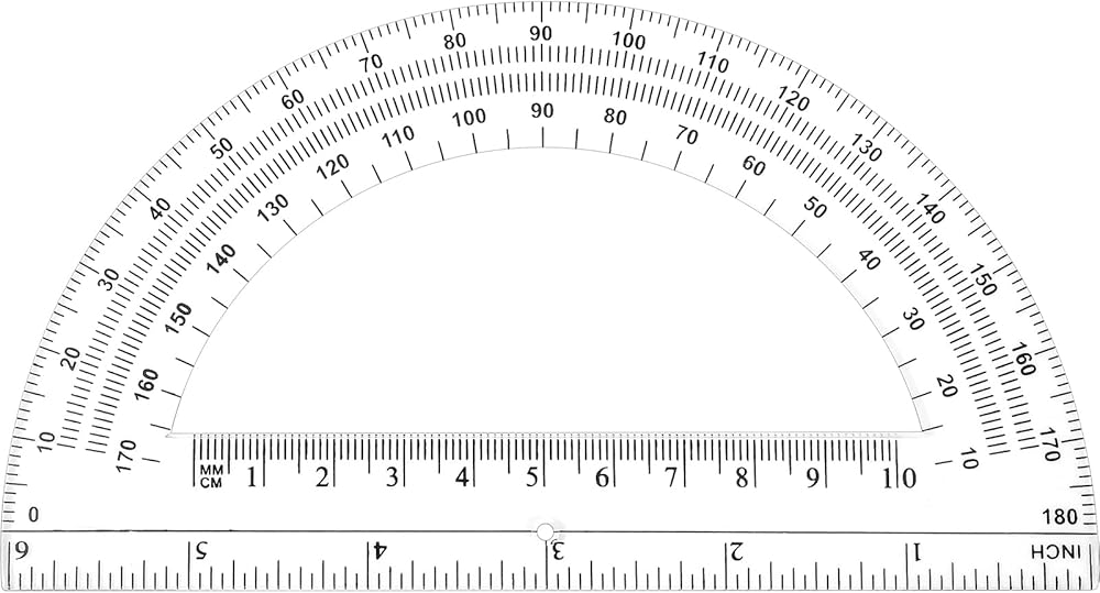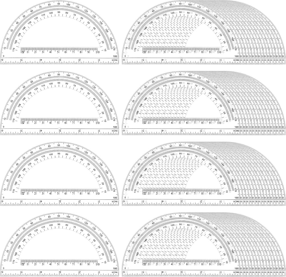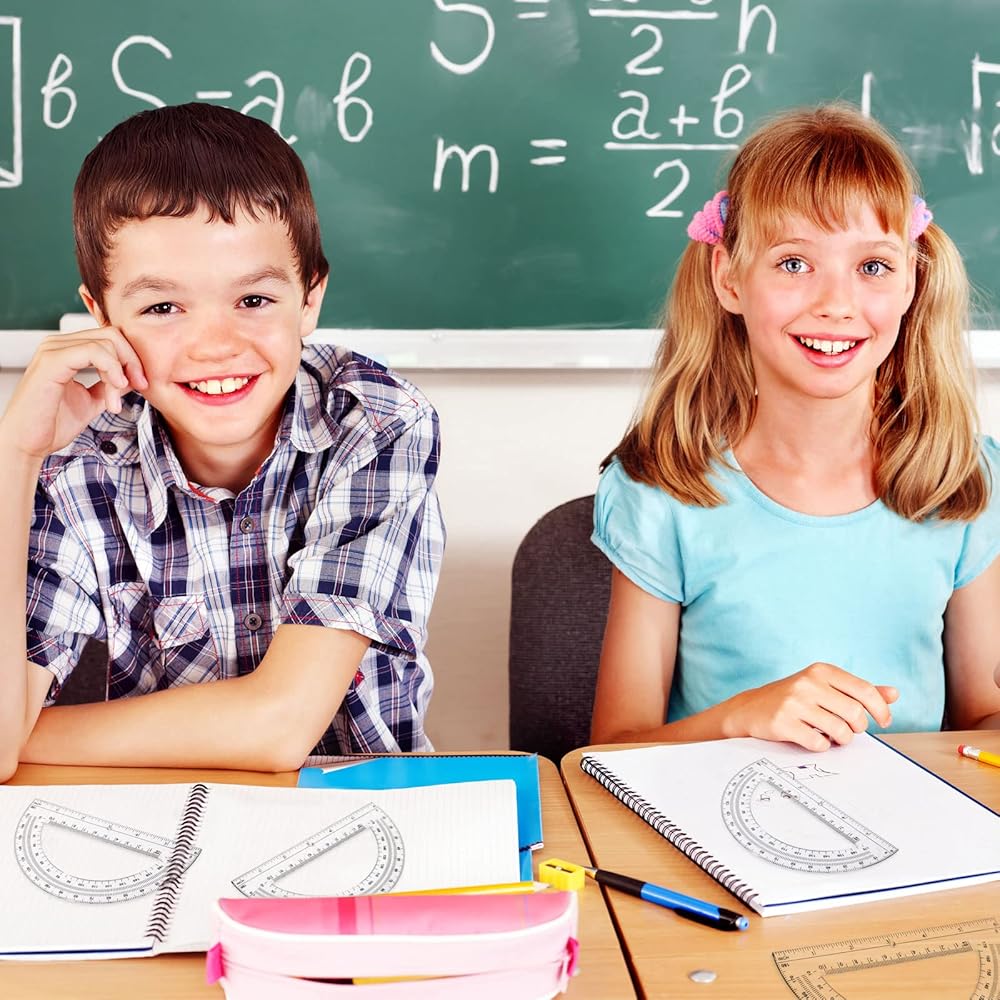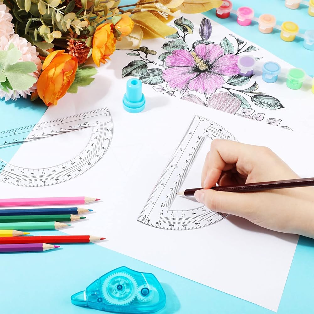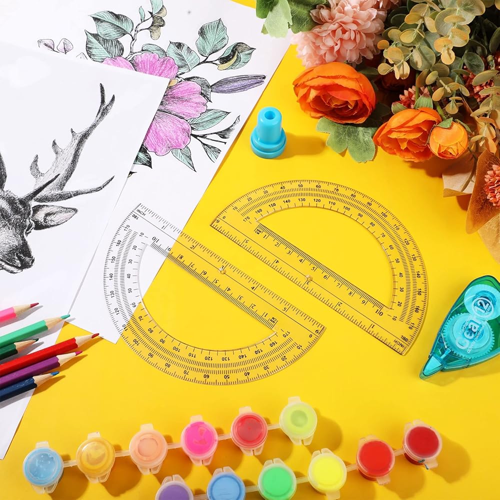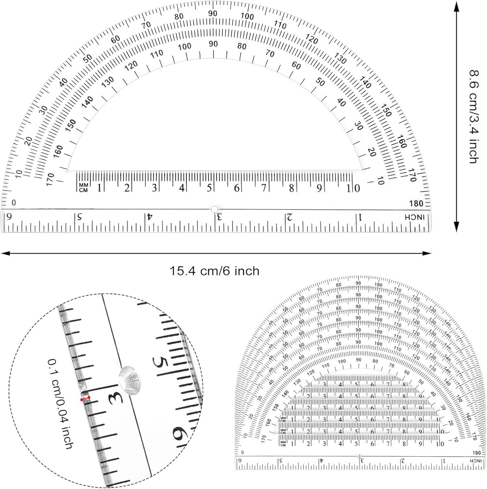 The ruler at the bottom can be applied for length measurement, which is convenient to draw straight lines and geometric figures, accurate measurement. There is a fan-shaped hole in the bottom center of each translucent colored protractors along which you can locate lines and angles.
