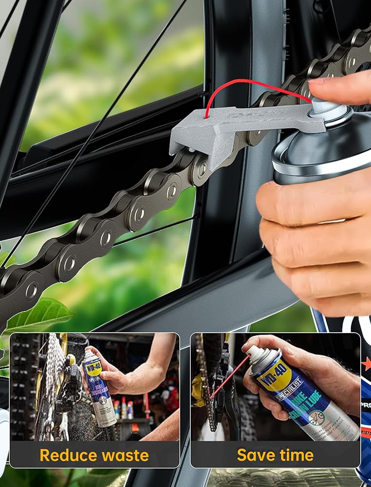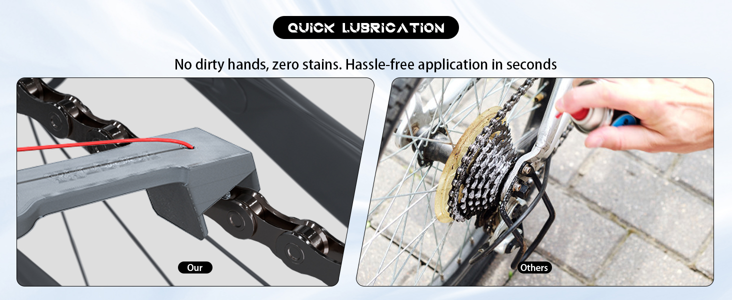 [100% Coverage] Unlike traditional simple direct spraying or conduit spraying methods, this oil applicator can accurately spray the inside of the chains on both sides, reaching 100% coverage after diffusion. It reduces mess, improving efficiency. The oil is distributed over the entire chain, enabling uniform chain lubrication and minimizing waste to the maximum extent. The whole chain can be quickly lubricated in 60 seconds, extremely time saving and convenient, making cycling both smooth and safe.