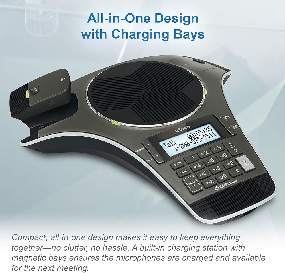 Free yourself from conference room wires, and help your team collaborate better. The VTech ErisStation analog wireless conference phone uses DECT 6.0 technology for a completely wireless conference experience. The system includes a DECT base with an analog PSTN connection and docking station to charge the phone with up to 24 hours of talk time. And just place the two wireless mics in the phone's built-in charging bays to get them ready for the next call. The VCS712 allows total freedom for placement in your conference room–without tripping over wires. With wireless mics, you'll experience less frustration and more successful conversations.
