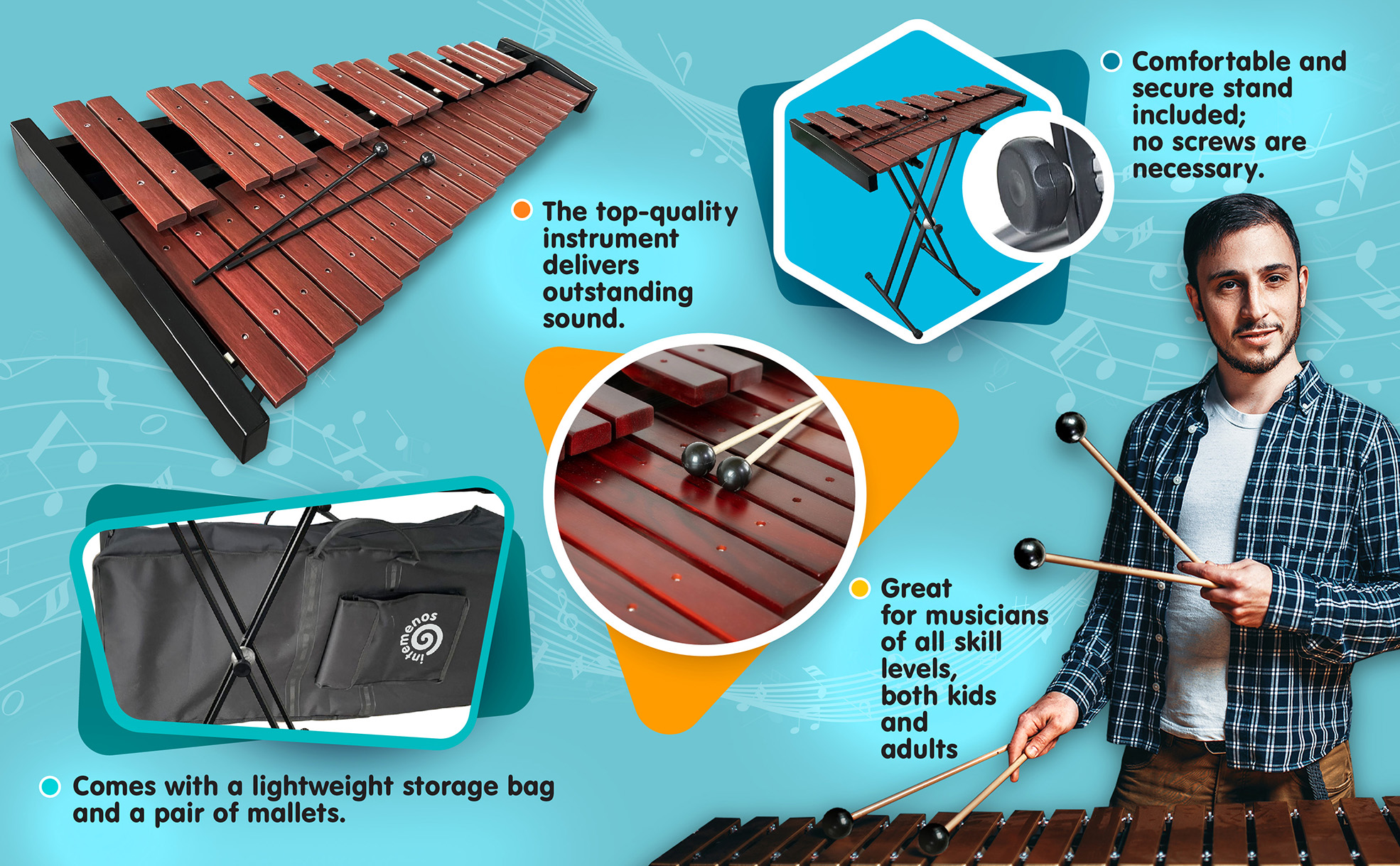 - 33" high metal stand is universal and is suitable for any xylophone or keyboard. The xylophone sits on top of the stand and does not require screws.