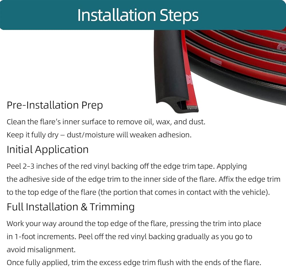 EASY INSTALL: Easy installation with no cutting or drilling required, 33 Feet length, usually enough to cover all 4 fender flares. No need re-order more.
