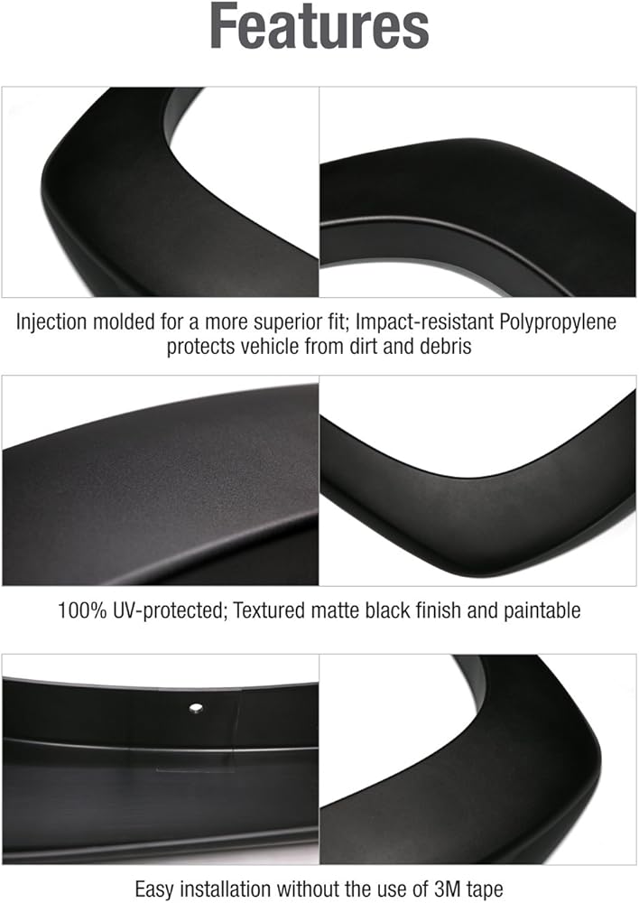 [FEATURES] Made of impact-resistant polypropylene with well-developed injection molding technology, NOT cheap ABS in the market, these flares will hug the curves your vehicle and eliminate the mess of using 3M tape.