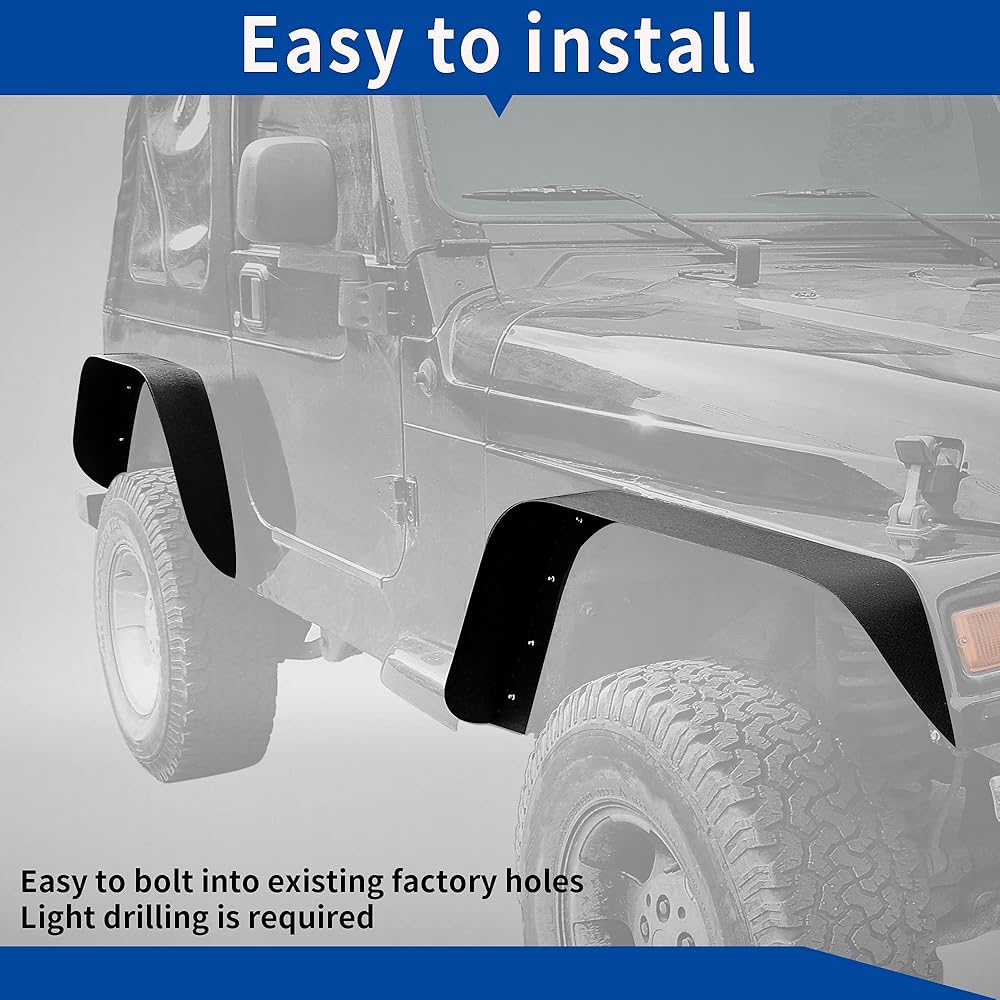 PERFECT FIT - Compatible for 1997-2006 Jeep Wrangler TJ. Includes 2 front driver fender flares & 2 passenger side fender flares.
