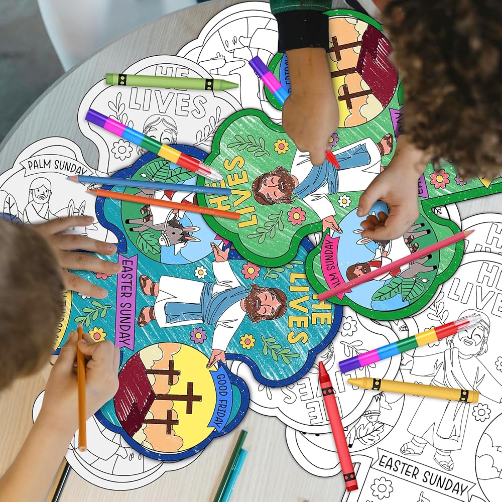 Christian crafts coloring poster: This religious poster tells the story of Jesus and allows young students to bring it to life with their own markers and crayons. With illustrations and text, these posters make interesting Sunday School activities or classroom decorations, preparing for Easter.