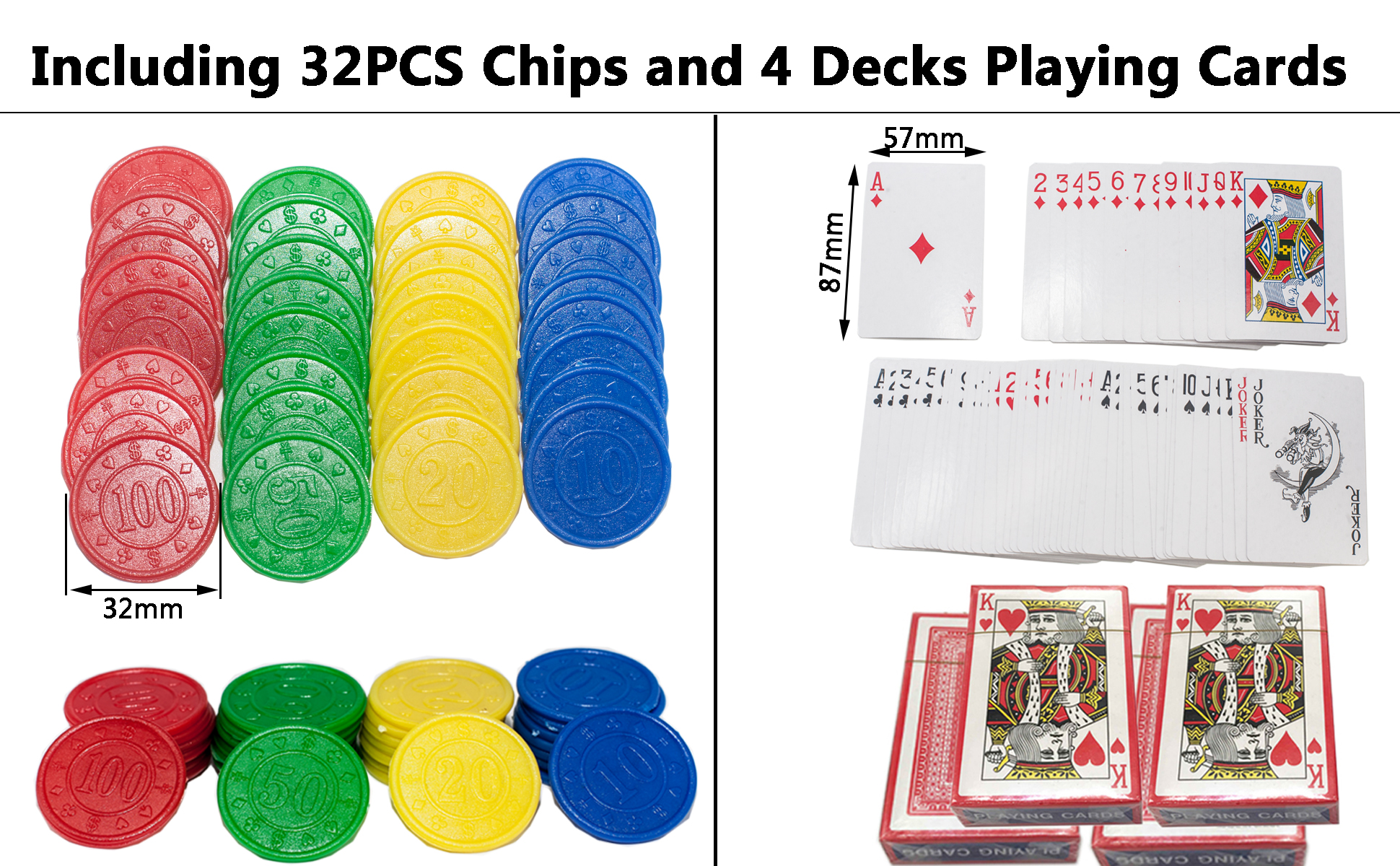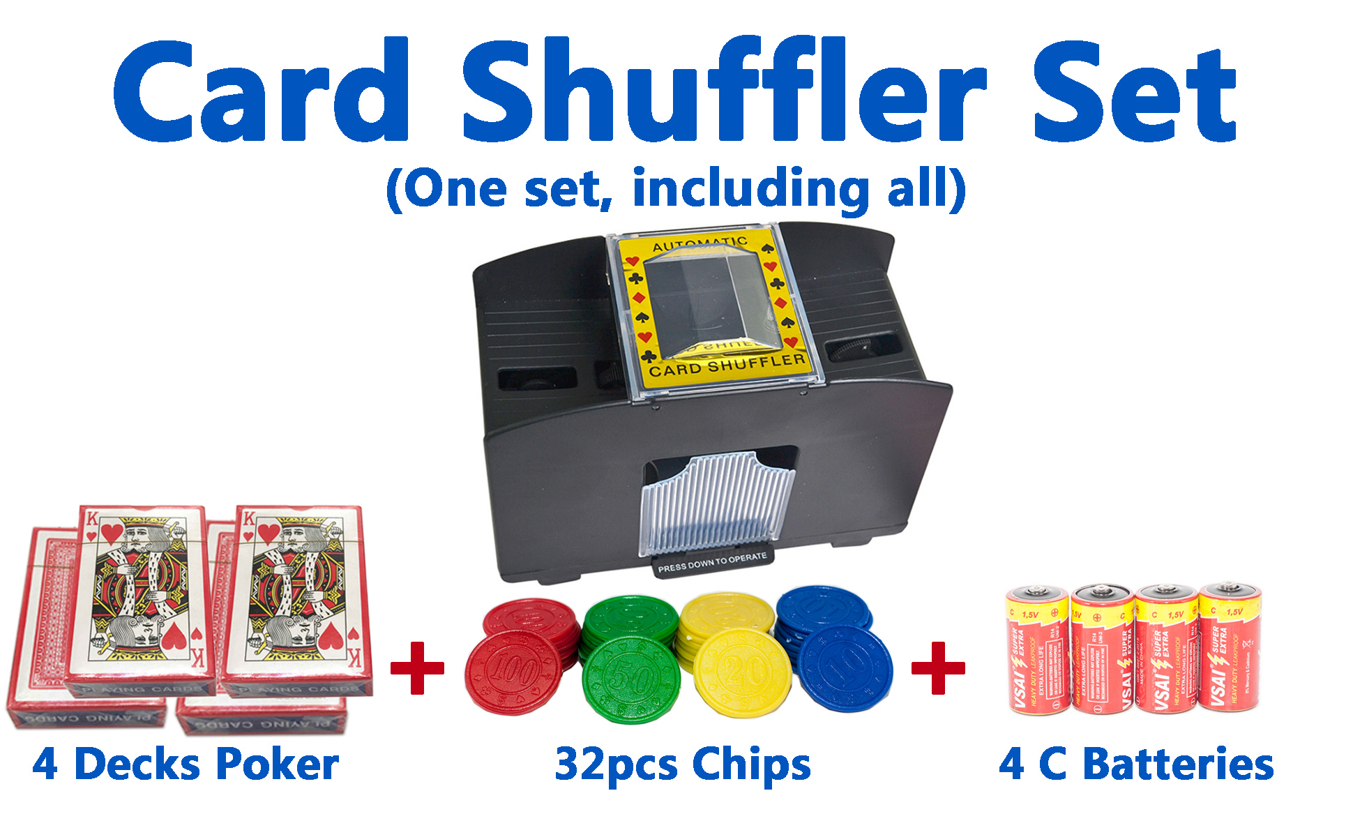 【Battery included】Package Includes: 4-deck Automatic Card Shuffler + 4 Decks Regular Poker + 4pcs C Batteries + 32PCS Poker Chips.4pcs C Batteries included,give you the greatest convenience.No need to buy batteries from other places.