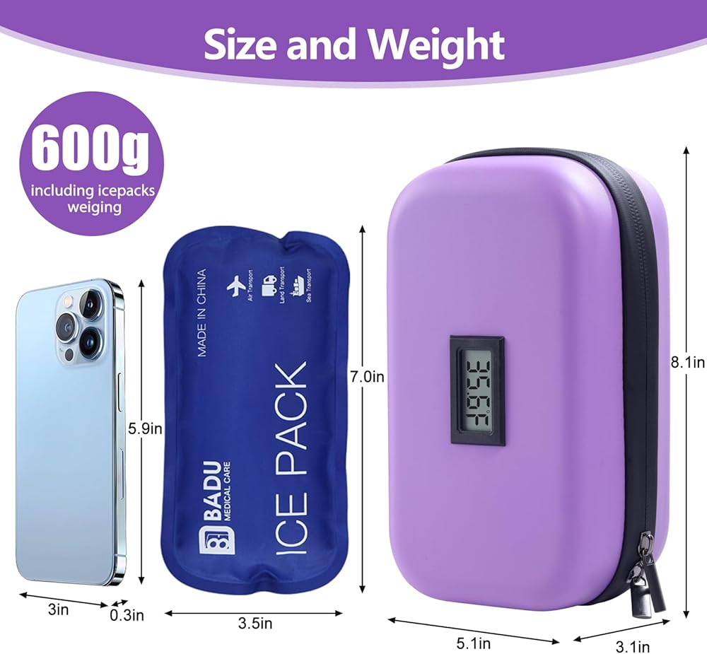 💊WHAT YOU WILL RECEIVE: 1 x Insulin Cooler Travel Case with Temperature Display (8.3"*4.7"*3.4"), including 2 Reusable Ice Packs(2*180g). Note: Props such as insulin pens in the pictures are for display purposes only and are not included in the product. If you have any concerns or questions regarding our medication cooler for travel, please do not hesitate to contact us, our dedicated team is available round-the-clock to assist you.