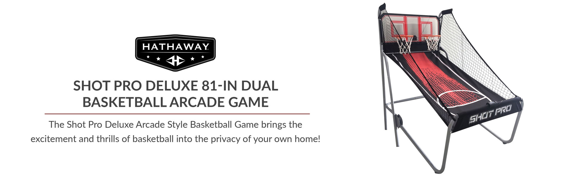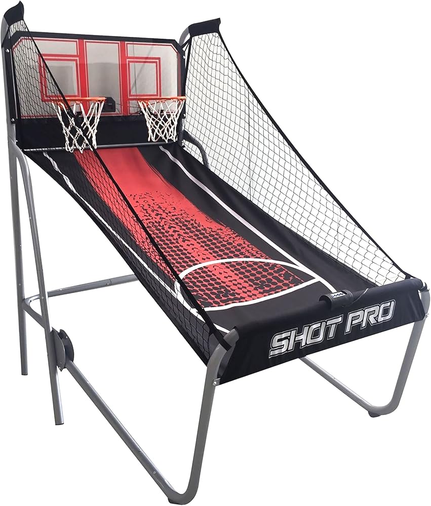 The Shot Pro Deluxe Arcade Style Basketball Game brings the excitement and thrills of basketball into the privacy of your own home! Unlike other home style basketball games, this commercial-grade game is built to last. It features a heavy-duty, 1.75-in diameter, rigid steel support frame. The sturdy acrylic backboard includes two heavy duty 12-in rims with built-in electronic scoring levers for automatic, accurate game scoring. The electronic scoring unit features 8 exciting game options and keeps track of the game time. This basketball game will provide hours of fun and competitive play for the whole family. When you're done playing, simply fold the Shot Pro into a space saving position for easy storage. 180-day limited warranty.