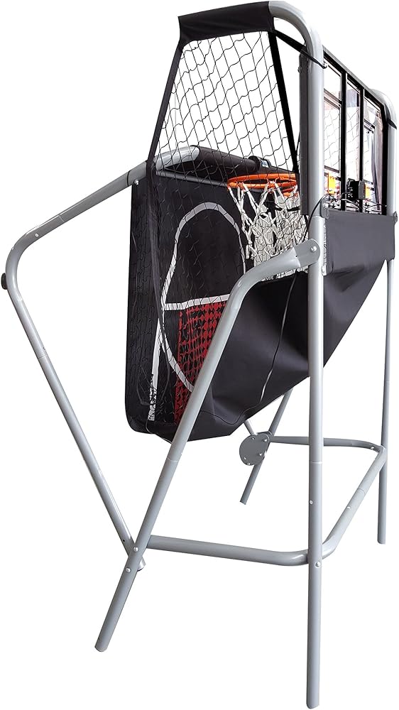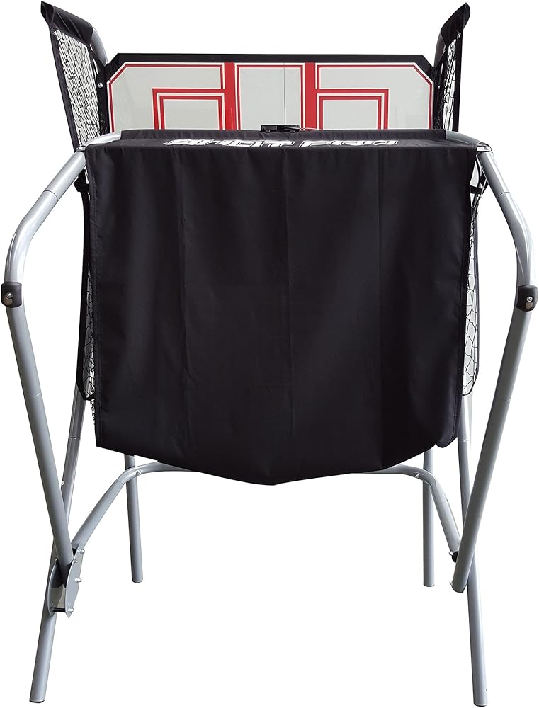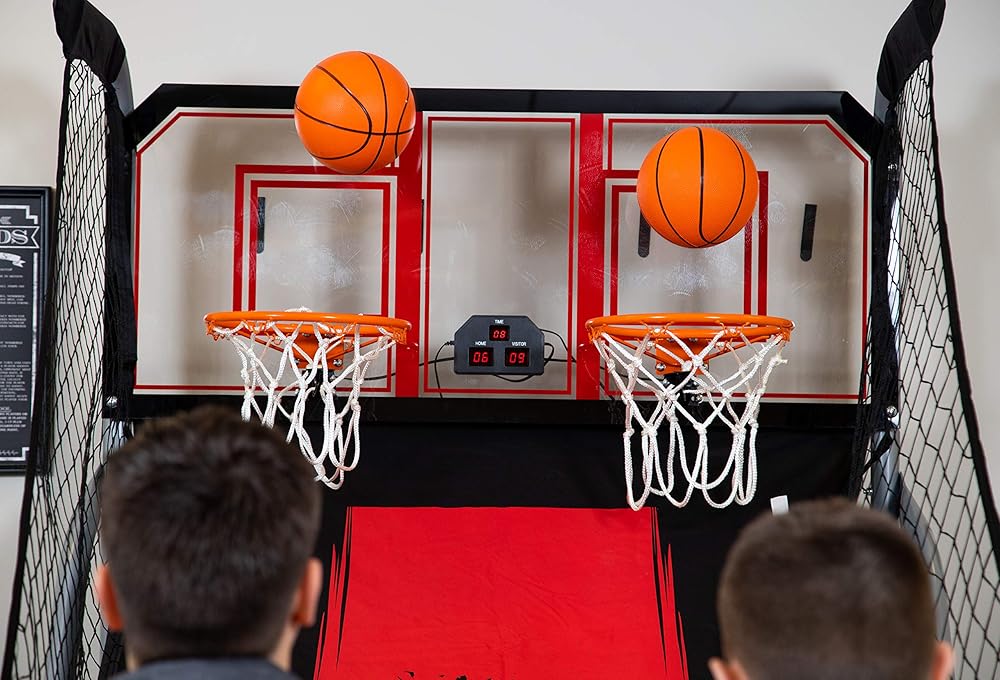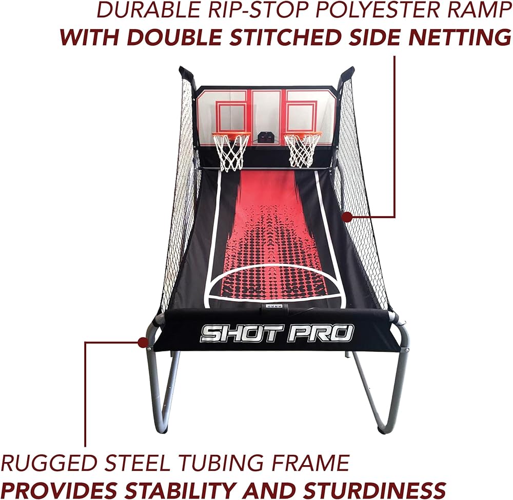 COMMERCIAL-GRADE GAME - A 1.75-in diameter steel tube frame and an acrylic backboard provide arcade-level durability and steadiness. Two powder-coated steel 12-in diameter rims and a rip-stop nylon ramp are designed to withstand shot after shot.
