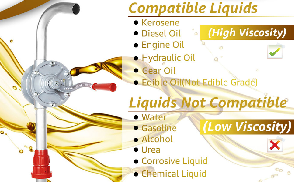 Scope Application: This rotary barrel pump is suitable for pumping kerosene, engine oil, hydraulic oil, diesel, and hydraulic fluid lubricating oil. NOT used for water, gasoline, urea, acid-base liquid, corrosive liquid, chemical liquid, edible liquid, and corrosive liquids.