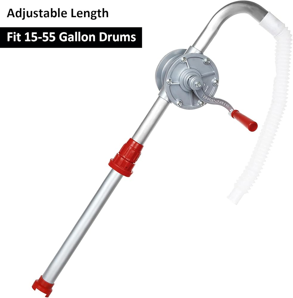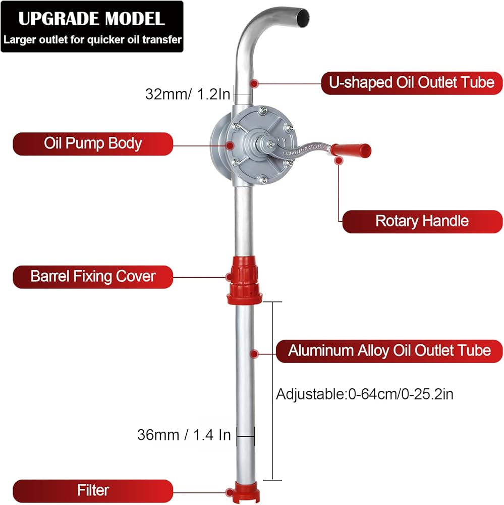 Upgrade 55 Gallon Drum Pump: 32mm Larger Oil outlet tube diameter for quicker oil transfer, Oil outlet pipe length 39 Inch, Overall Length 51 Inch, that can be adjusted to fit 15 - 55 gallon drums.