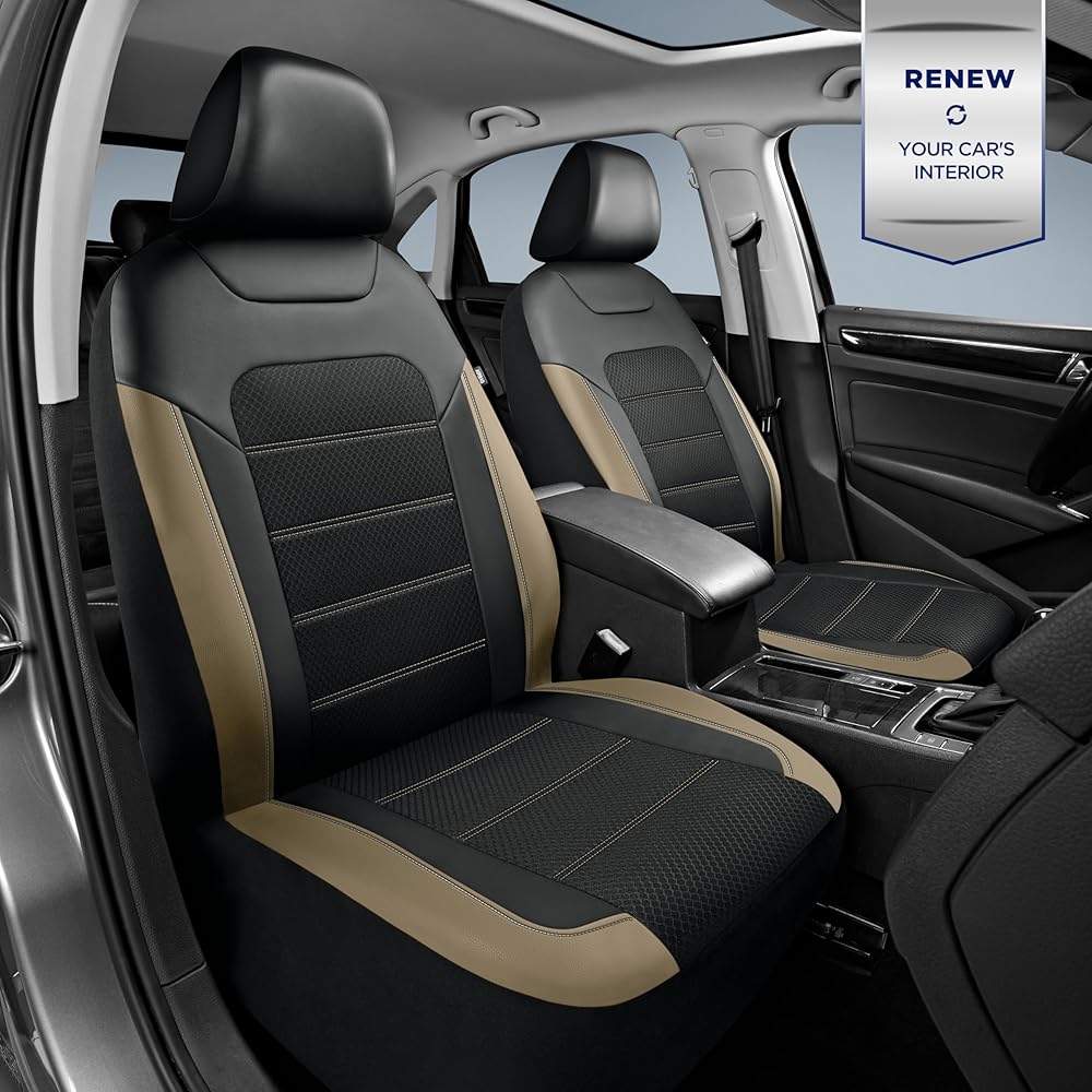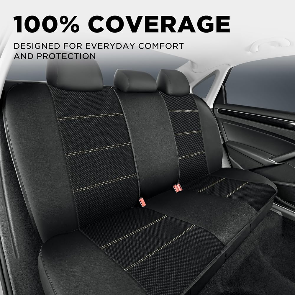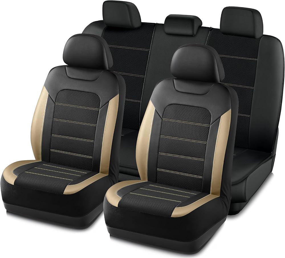 PIC AUTO Car Seat Covers, Premium Leather and Air Mesh Automotive Sports Seat Covers Full Set, Front and Rear Bench, Airbag Compatible Universal Fits Most Cars, SUVs, Trucks and Vans (Black & Beige)