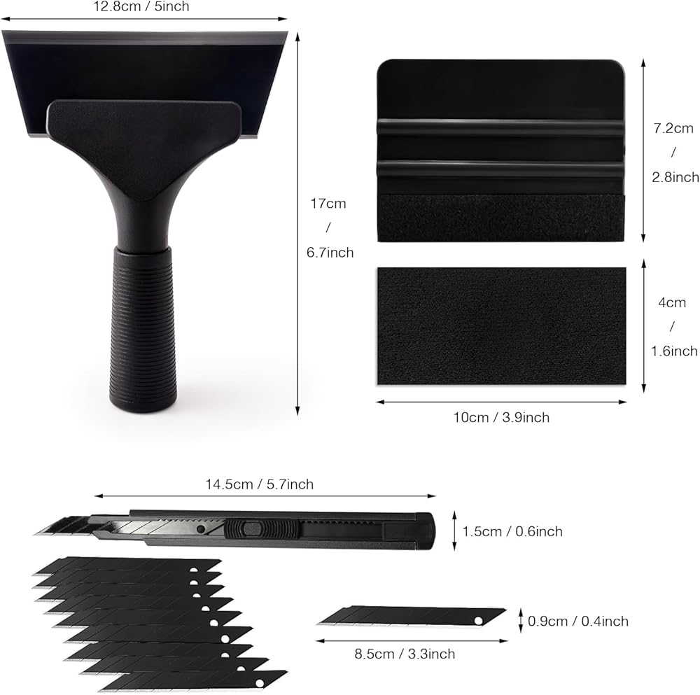 PACKAGE INCLUDED: 1* 5 INCH rubber squeegee +1* 4 inch felt squeegee for vinyl +1pc extra squeegee felt +1pc 9mm utility knife with 10pcs replacement blades