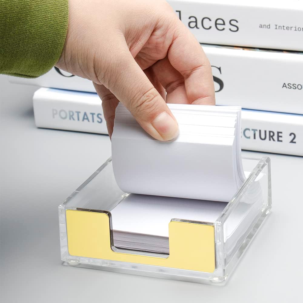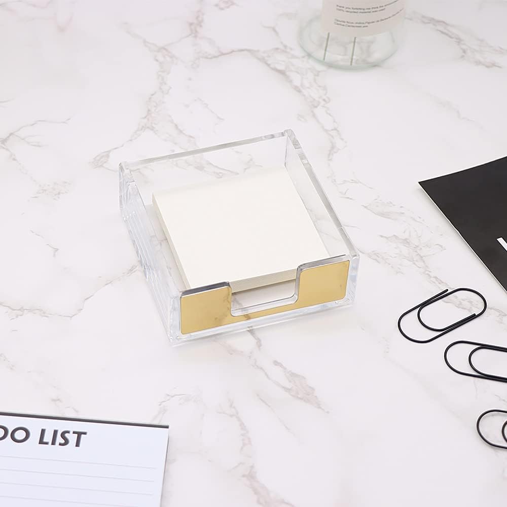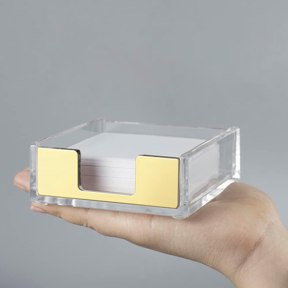 FEATURE -- Clear acrylic body desktop office memo cube holder dispenser with copper gold tone front view;