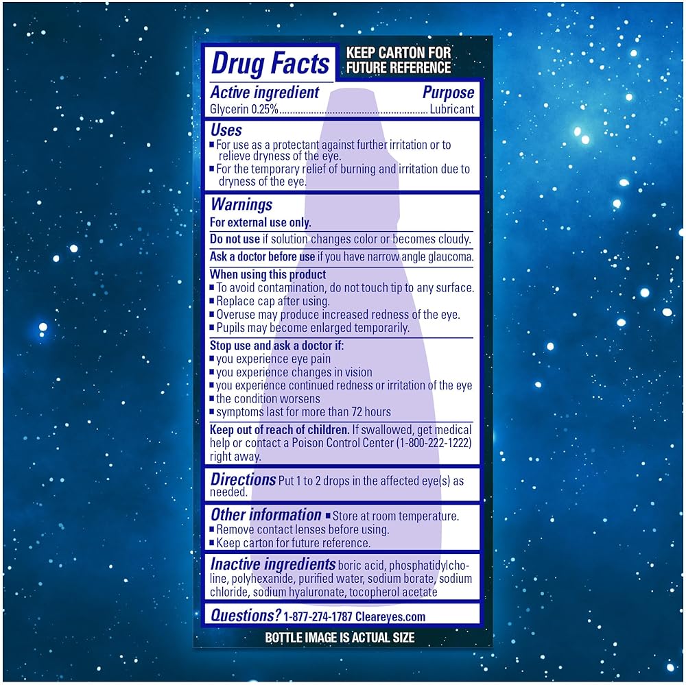 Clear Eyes Nighttime Restoring Eye Drops for Dry Eyes soothe tired, irritated, and dry eyes. This nourishing formula enriched with lipids and antioxidants soothes for up to 12 hours for a comfortable night's sleep. Incorporate these dry eye drops into your nighttime routine to help maintain your eye care and wake up with refreshed eyes that look and feel their best in the morning. These hydrating and lubricating eye drops are safe for nightly use and provide tired, irritated, and dry eye relief without the blurry vision caused by an eye gel or eye ointment and are formulated without parabens, dyes, and benzalkonium chloride. Clear Eyes is the #1 selling brand of eye drops and has an eye drop solution for any eye care need, including redness relief, sensitive eyes, contact lenses, dry and itchy eyes, and multi-symptom relief.