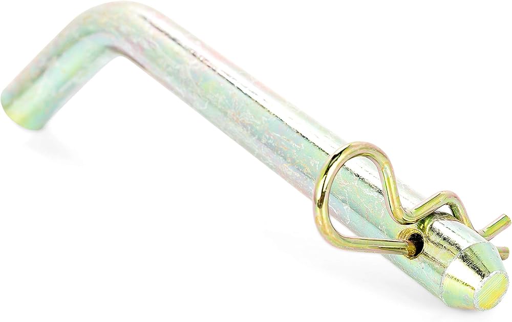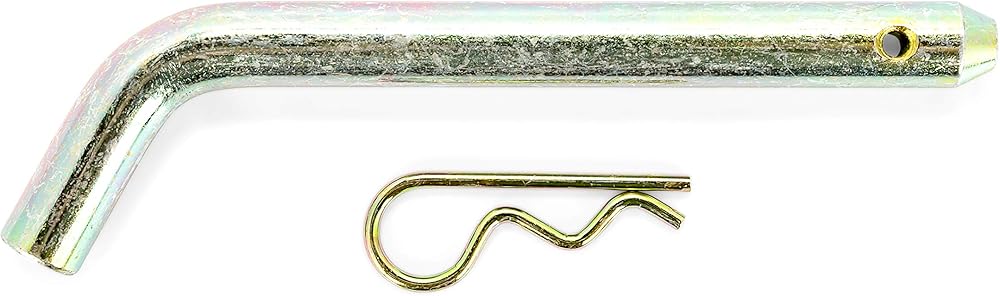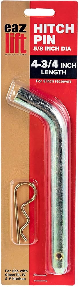 The 3-Inch Eaz-Lift Receiver Hitch Pin and Clip securely keeps a receiver hitch-mounted accessory in place while towing. Compatible with 3-inch receivers, the receiver hitch pin has a 5/8-inch diameter and a usable length of 4-3/4-inches. It features a 115-degree bend for easy handling and additional security. Includes a clip to keep the receiver hitch pin securely engaged to the trailer hitch and ball mount. Constructed of durable, zinc-plated carbon steel.
