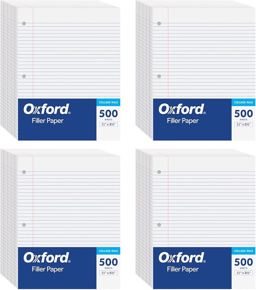 Oxford Filler Paper. 8-1/2" x 11". College ruled. 3-Hole punched. 1000 Sheets per pack.