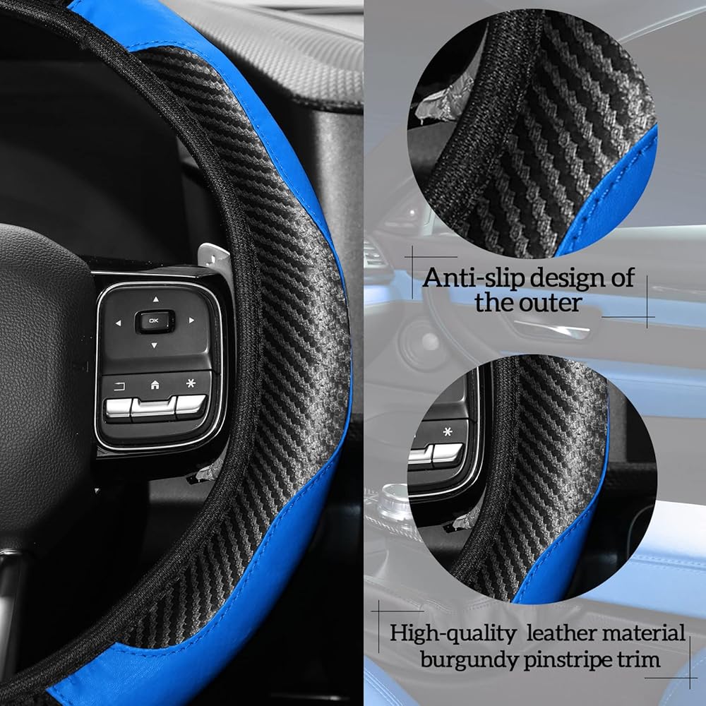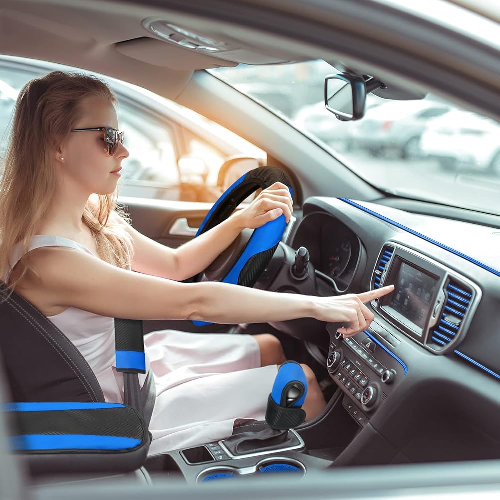 Riakrum 30 Pcs Car Accessories Set Blue and Black PU Leather Steering Wheel Cover Auto Interior Accessories Gift Car Vent Trim Strips Air Conditioner Insert Strips with Installation Tool