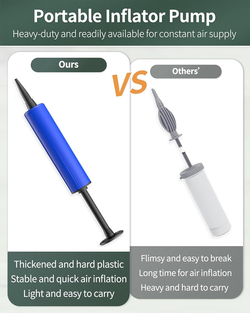 Quick Inflation: Come with a thick and heavy-duty inflator pump – readily available for constant air supply. Just pull and push the rod back and forth to inflate the ball.