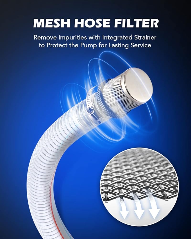 Strongly Built for Lasting Service: This portable oil extractor pump boasts a sturdy copper motor with steel shell, 4'11" supply hose, and 6'6" discharge hose to provide superior strength and endurance for years of resilient use
