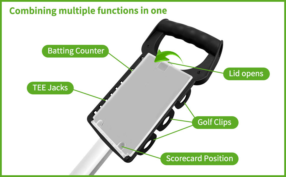 ✅【EASY TO USE】Multi-purpose handle includes scorecard holder with cover, tee holder, golf ball holder, and shot counter wheel so you won't forget your score.