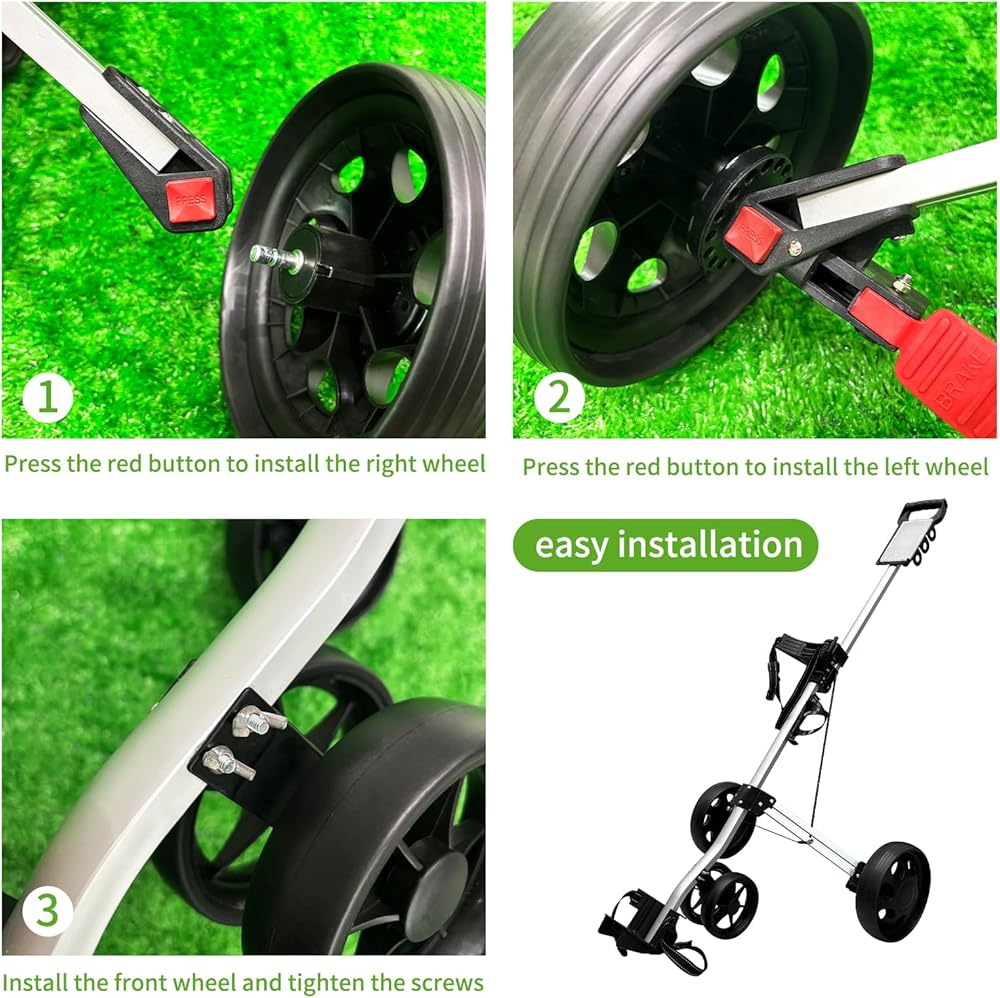 ✅【BRAKE SYSTEM】This lightweight folding walk-around golf cart is equipped with foot brakes on the rear wheels, when you are ready to hit your next shot, apply the brakes to hold the golf cart in place, which prevents the cart from rolling while parked.