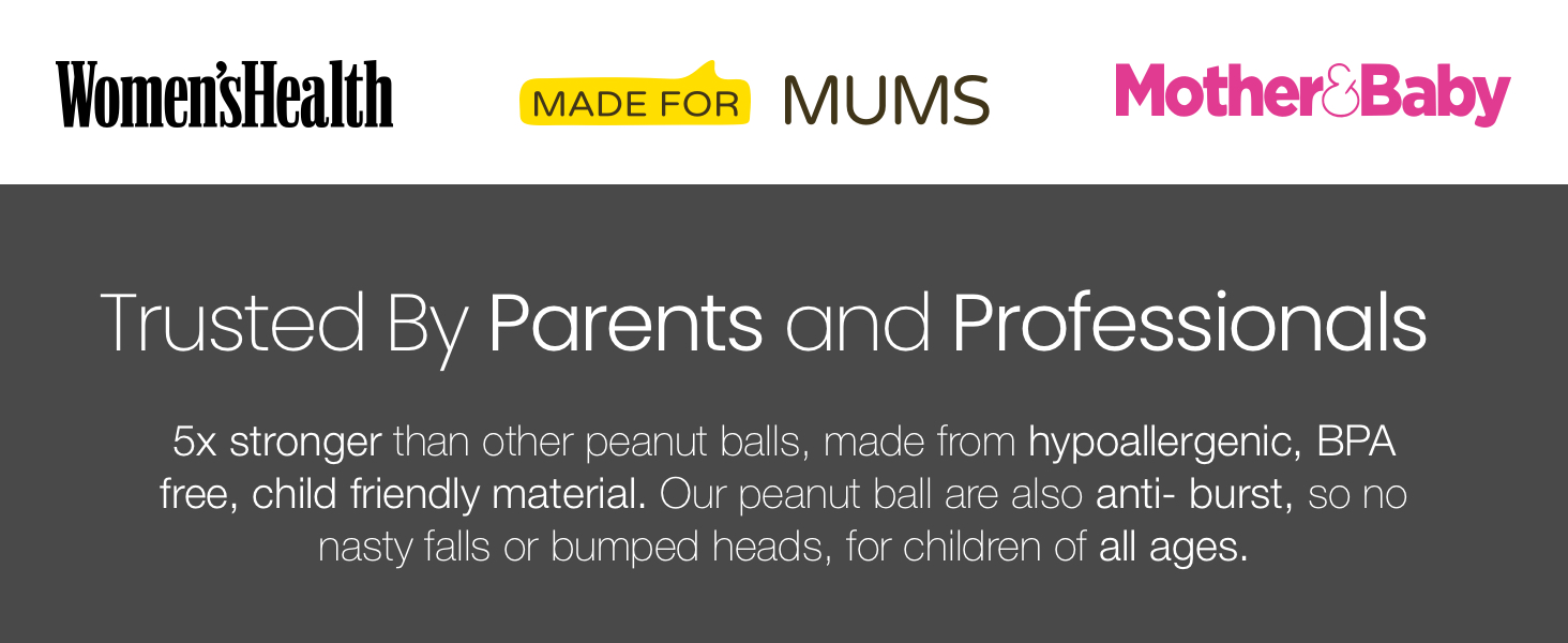 👑 5x Stronger than a Regular Peanut Ball: Our premium texture has been tested to provide superior strength and stability. This means our ball limits movement to forward and backward motion only, creating a secure head-space for your child.